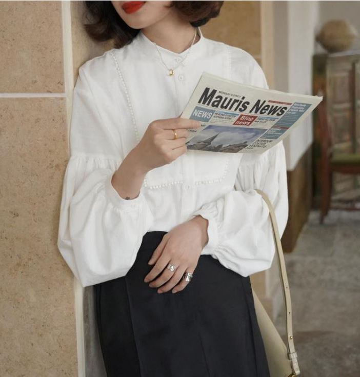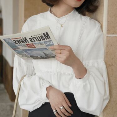 ヨーク切替え ぽんぽんレーストリミング ランタンスリーブ ぽわん袖 バンドカラー トップス 白シャツ ブラウス ミディアム丈 長袖 ボリューム袖 パフスリーブ ドロップショルダー 切り替えデザイン レース 前開き 綿 かわいい 大人可愛い きれいめ シンプル カジュアル 上品 おしゃれ ガーリー 無地 春 秋 冬 レディース 女性用 OL 通勤 学生 通学 デート お出かけ 公園デビュー 女子会 着回し 普段使い 重ね着 韓国系 コーデ 体系カバー S M L XL ゆったり サイズ ホワイト