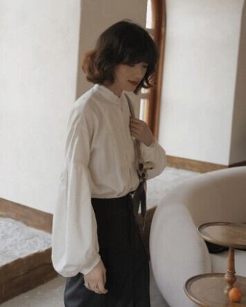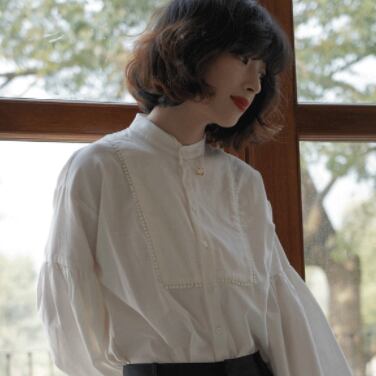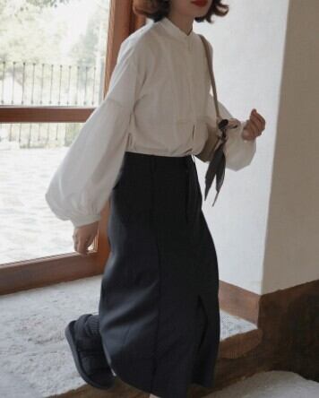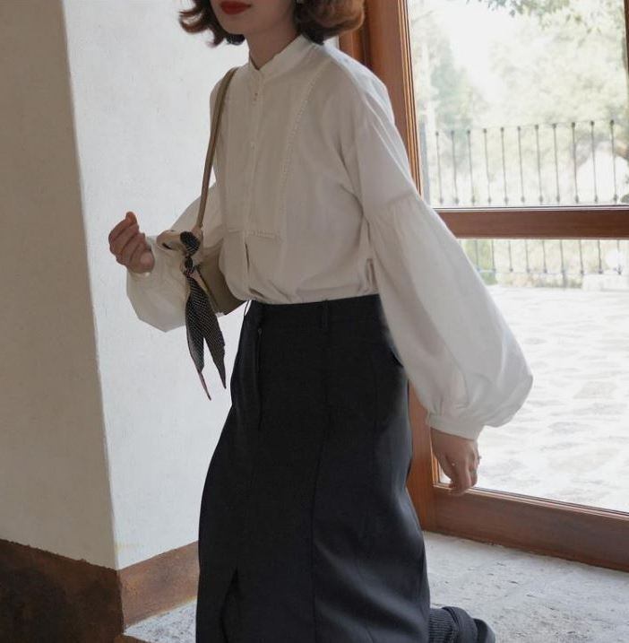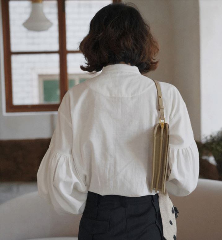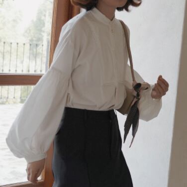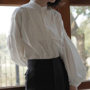 腕の途中からふんわりふくらむランタンスリーブが大人可愛いバンドカラーブラウス。