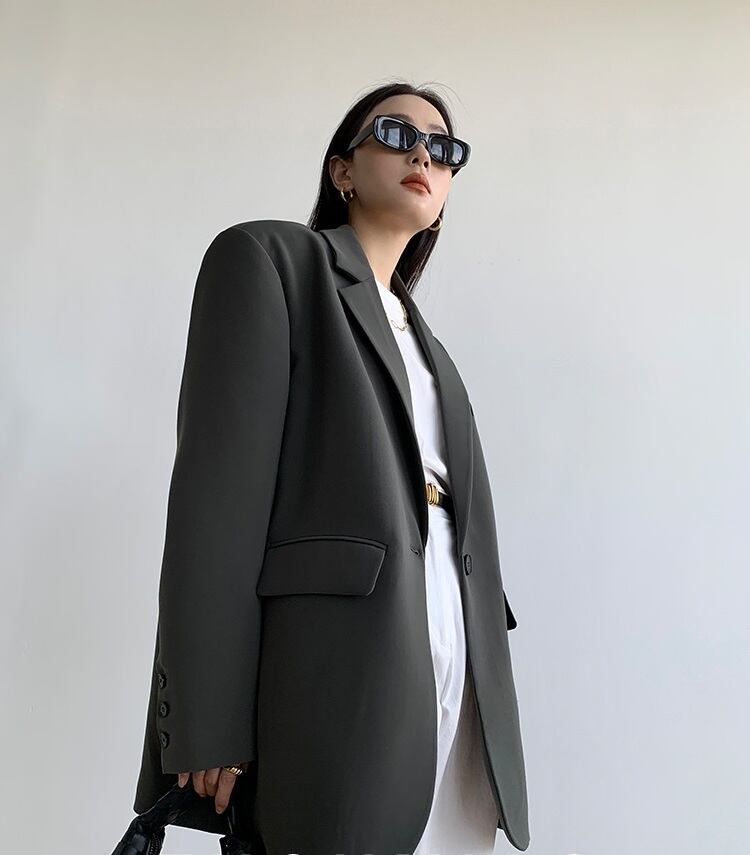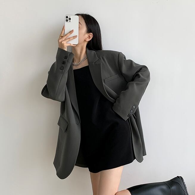 オーバーサイズ ワンボタン テーラードカラー チュニック丈 シック アウター ジャケット 上着 長袖 ドロップショルダー Vネック 襟付き 前開き ポリエステル きれいめ シンプル カジュアル 上品 おしゃれ かっこいい 大人女子 こなれ感 ラフ メンズライク マニッシュ ルーズ クール 無地 春 秋 冬 2021 レディース ママ OL 通勤 学生 通学 デート お出かけ 女子会 休日 着回し 普段使い 重ね着 韓国系 コーデ 体系カバー S M L 大きめ ゆったり サイズ ブラック グレー