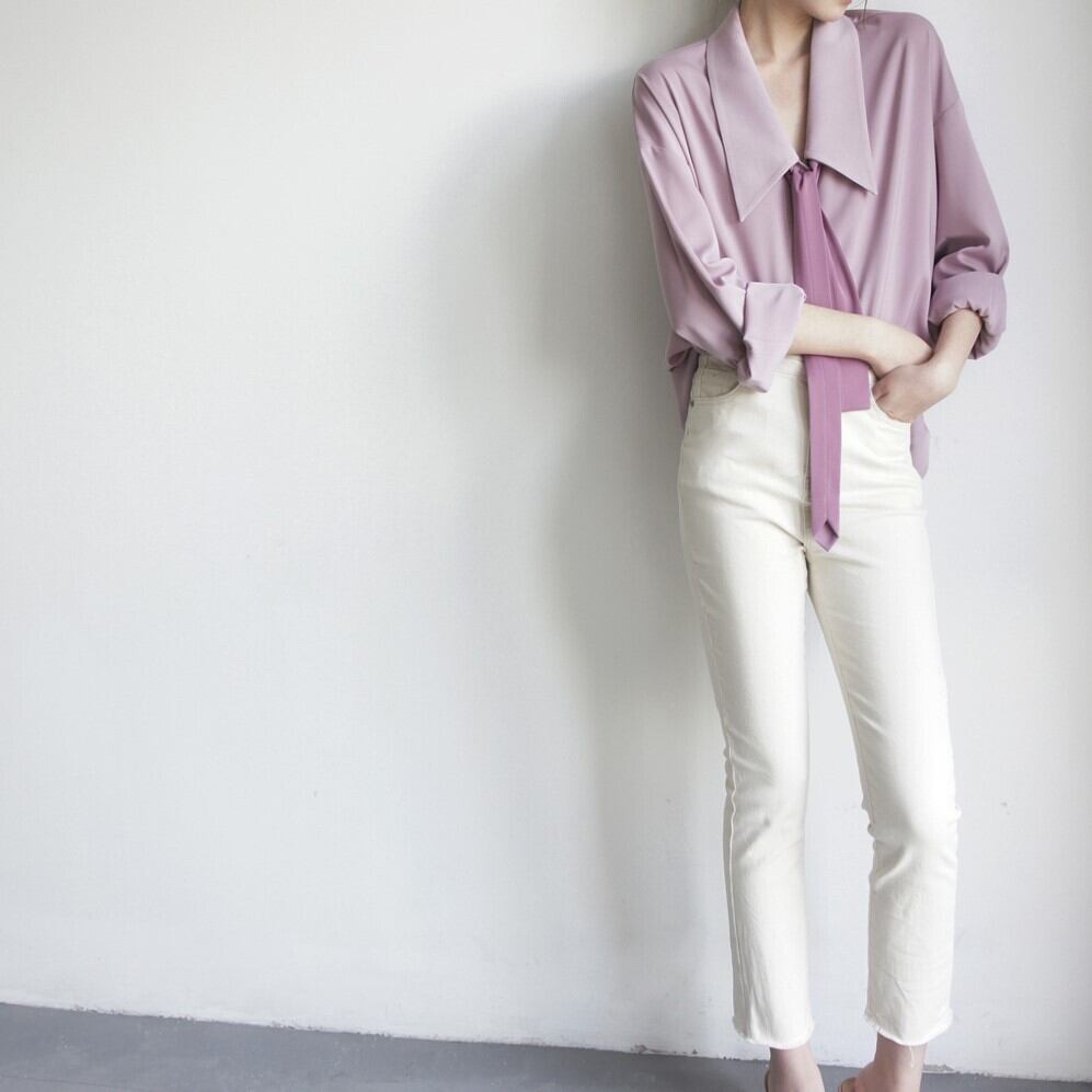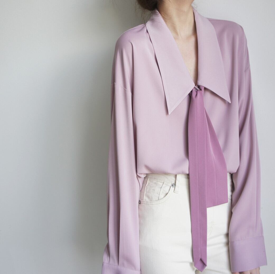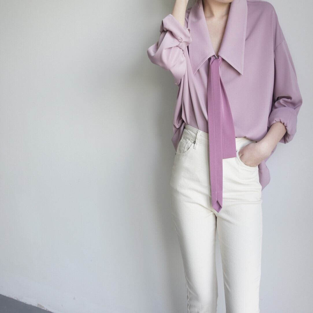 このネクタイブラウスは、春夏秋冬を問わず、着回しの効くアイテム。きれいめなスタイルから、ラフなコーディネートまで、どんなスタイルにも合わせやすいです。