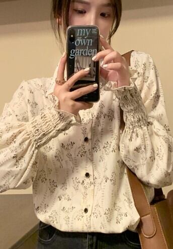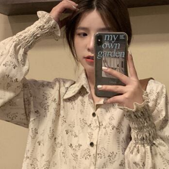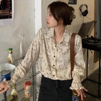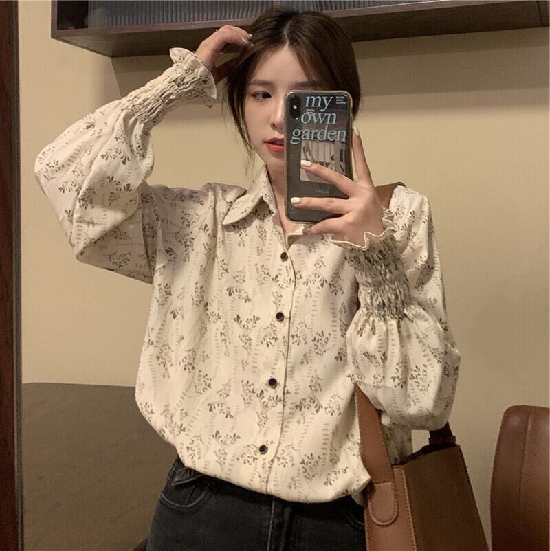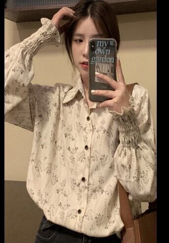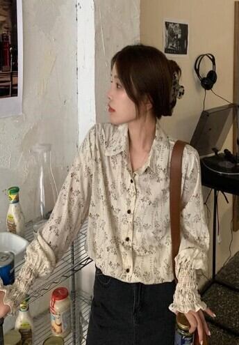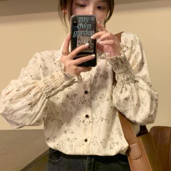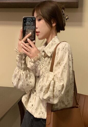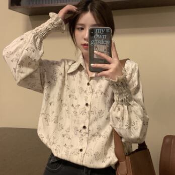シフォンブラウス トップス シャツ スイート ガーリー フェミニン アプリコット レギュラー丈 袖あり 長袖 襟付き シャーリング シングルブレスト ボタン ポリエステル 大人女子 大人 上品 おしゃれ デイリーウェア エレガント レトロ レトロ風 こなれ感 ラフ 個性的 デザイン 主役級 存在感 柄 花柄 フラワー 春 スプリング 夏 サマー 10代 20代 30代 レディース 女性用 オフィス ビジネス OL S M L XL 3XL 大きいサイズ プラスサイズ