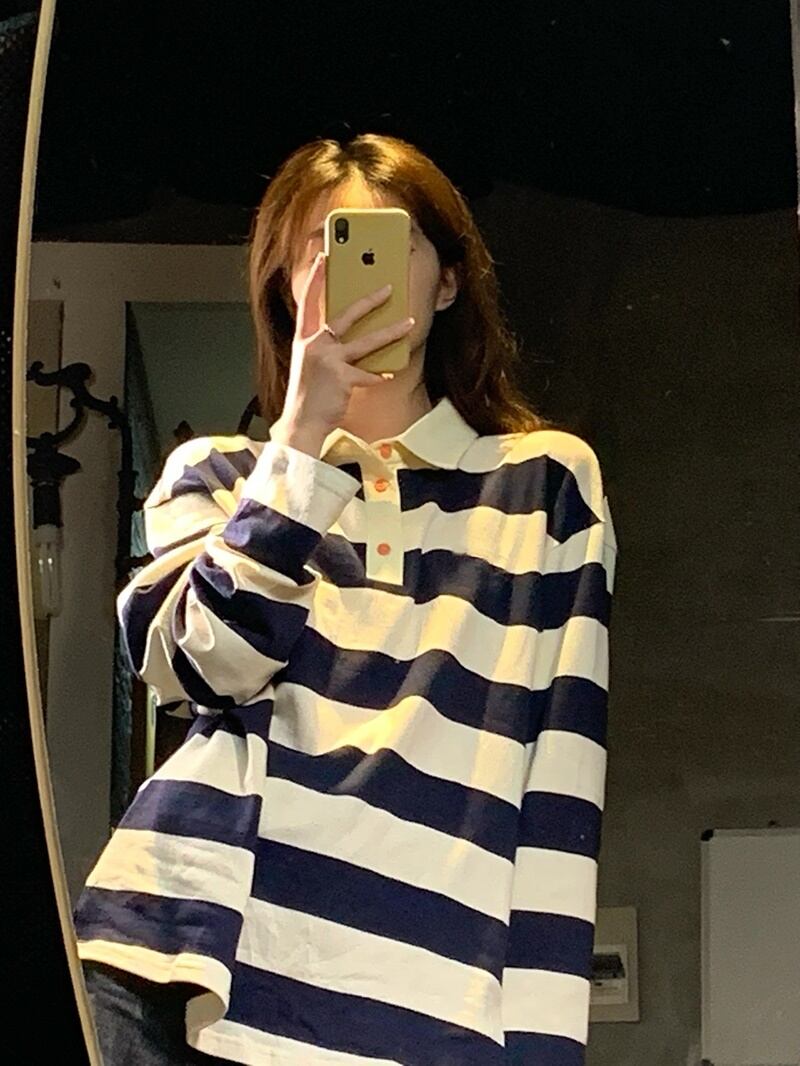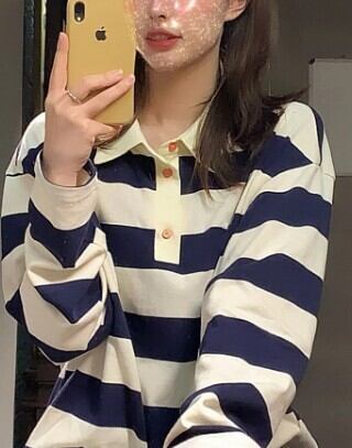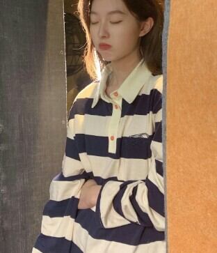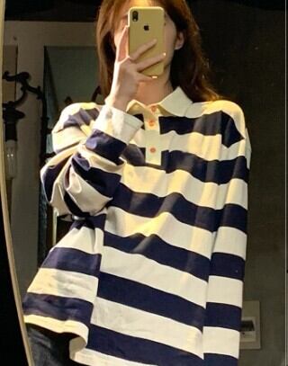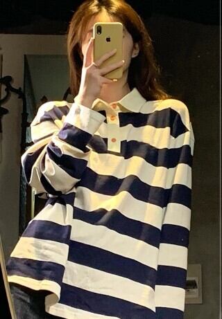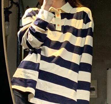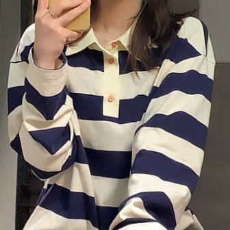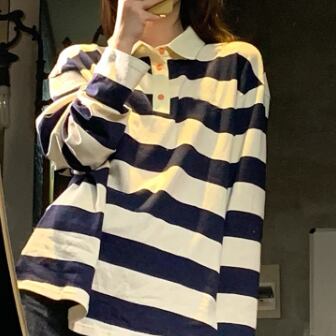 ポロカラーTシャツ トップス プルオーバー カジュアル ホワイト 白 ブルー 青 レギュラー丈 袖あり 長袖 襟付き ストレート 大人女子 大人 上品 おしゃれ デイリーウェア レトロ レトロ風 こなれ感 ラフ ルーズ シルエット 個性的 デザイン 主役級 存在感 柄 ストライプ 縞模様 ボーダー 春 スプリング 秋 オータム 10代 20代 30代 レディース 女性用 学生 通学 着回し 普段使い S M L XL 2XL 3XL 大きいサイズ プラスサイズ