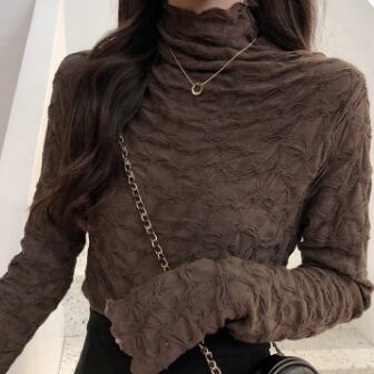 クラシックな大人女子にぴったりな、シンプルなブラウンの長袖Tシャツです。レギュラー丈で袖あり、ハイネックが上品な印象を与えます。ストレートなシルエットで、大人の女性にぴったりな美しいラインを描きます。