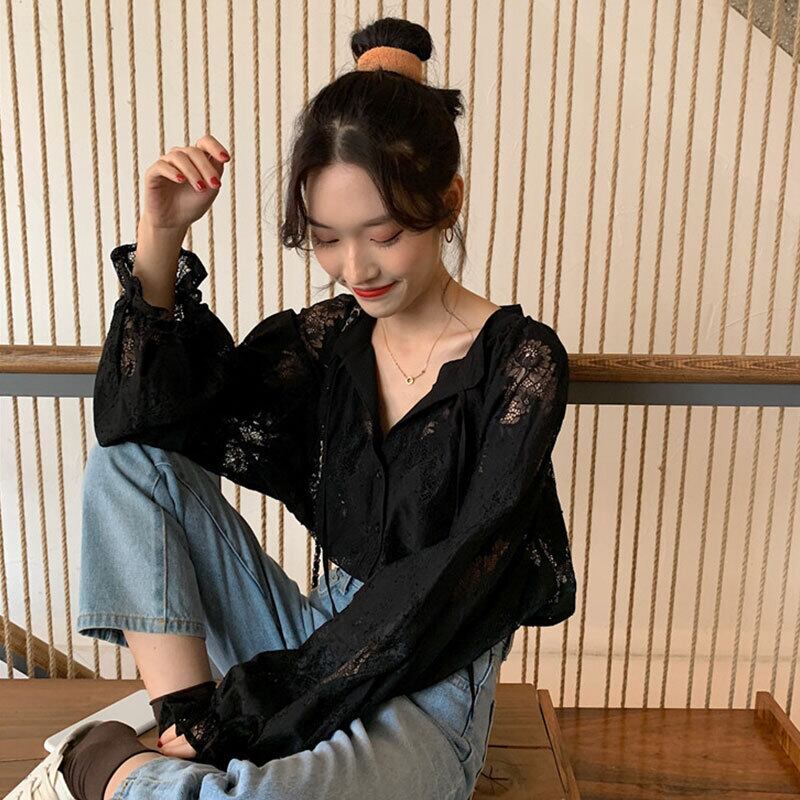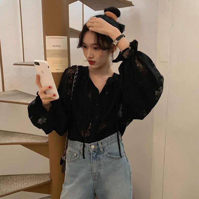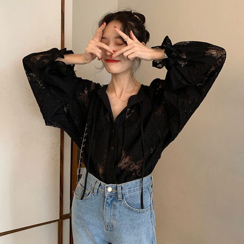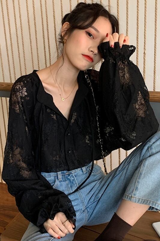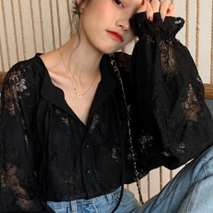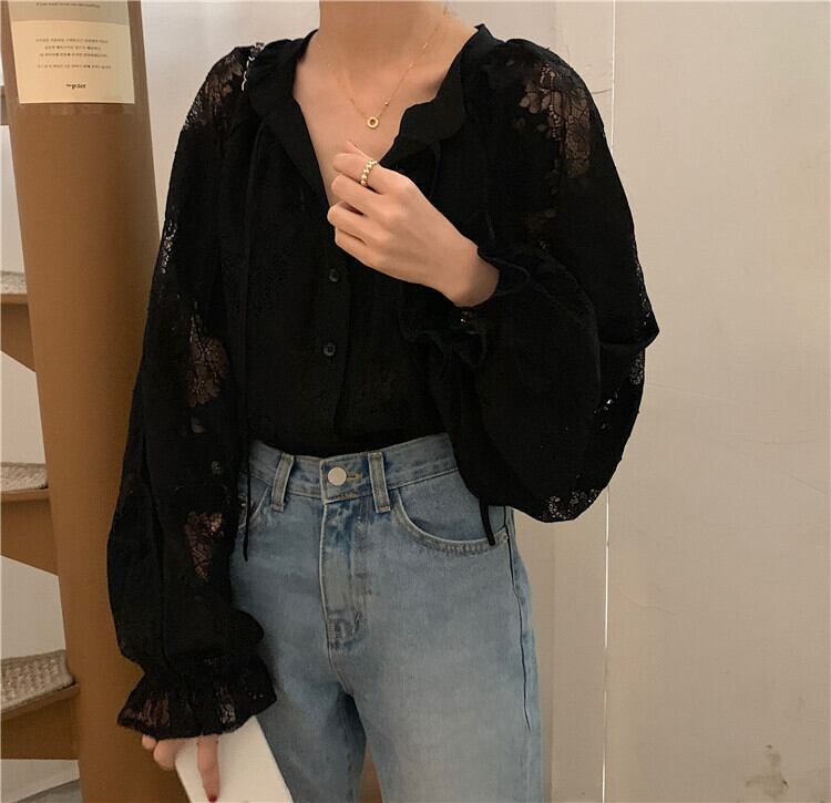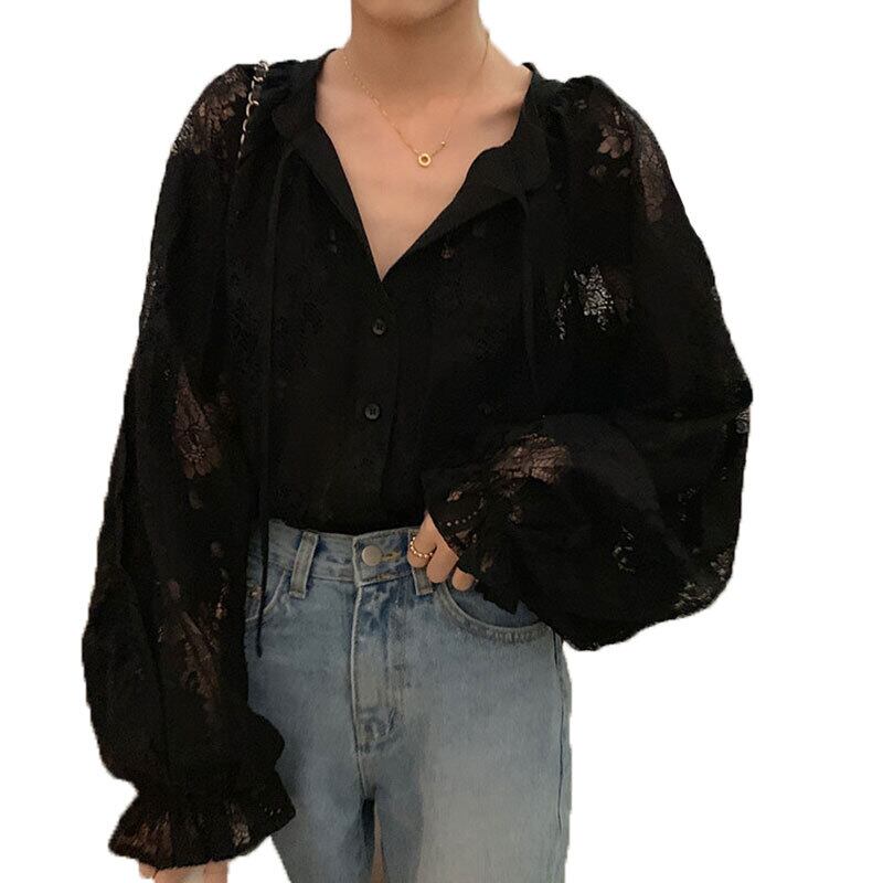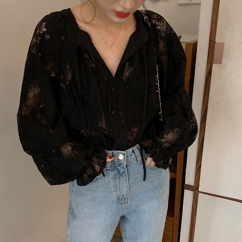 レースブラウス トップス シャツ ブラウス クラシック ブラック 黒 レギュラー丈 袖あり 長袖 Vネック シングルブレスト ボタン 大人女子 大人 上品 おしゃれ きれいめ シンプル デイリーウェア レトロ レトロ風 こなれ感 ラフ ルーズ シルエット 個性的 デザイン 主役級 存在感 無地 春 スプリング 秋 オータム 10代 20代 30代 レディース 女性用 学生 通学 着回し 普段使い トレンド S M L XL 2XL 3XL 大きいサイズ プラスサイズ