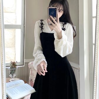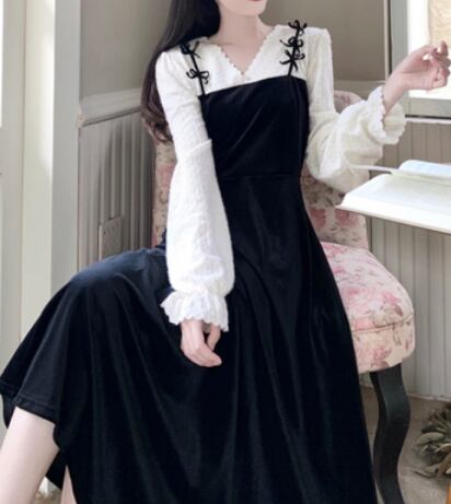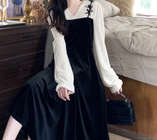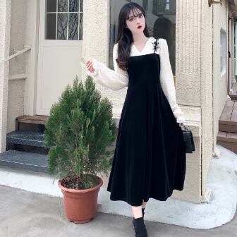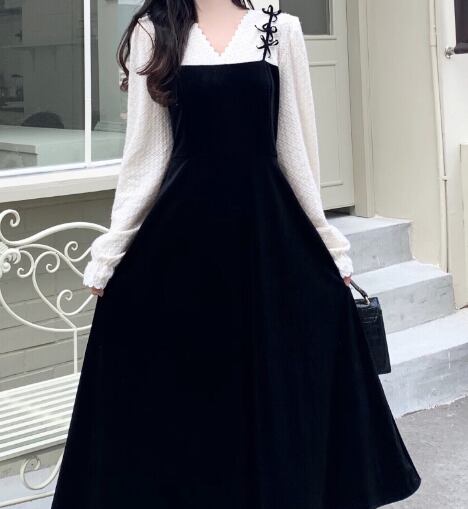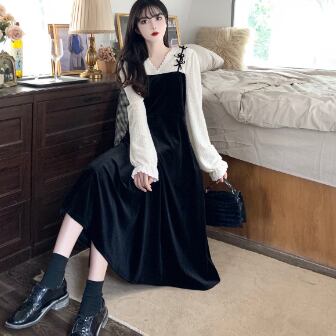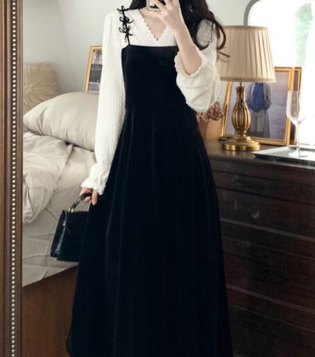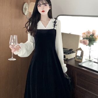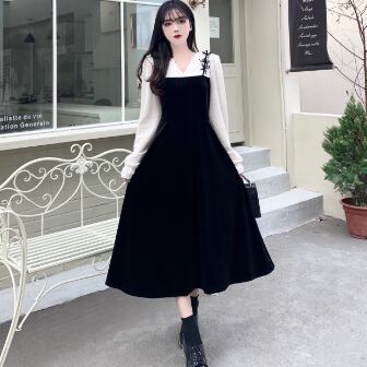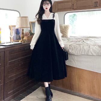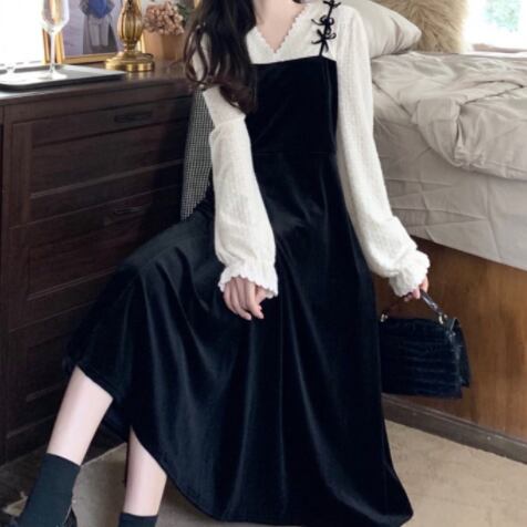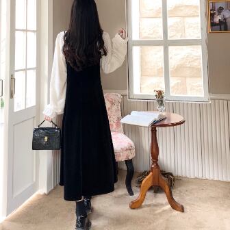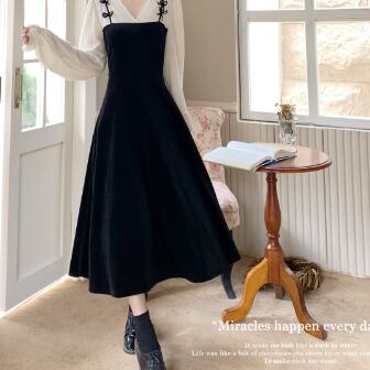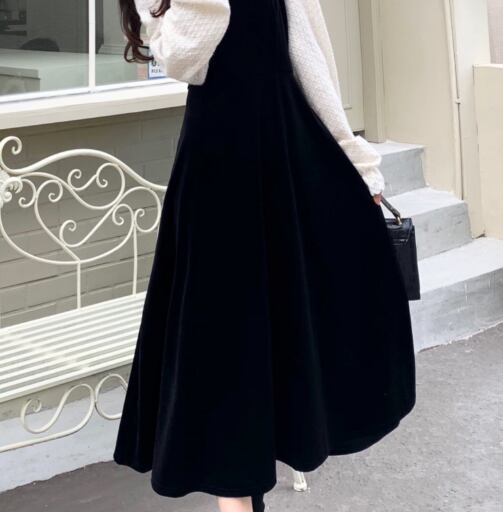 黒のロングワンピースで、ラウンドネックとAラインのデザインが魅力的な一着です。大人可愛く、落ち着いた雰囲気を演出してくれます。