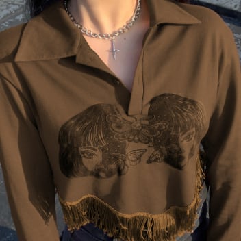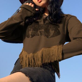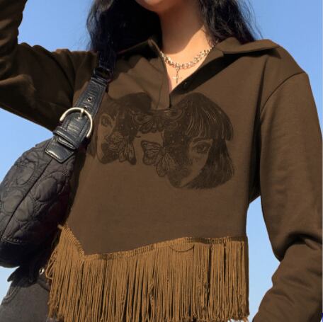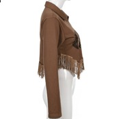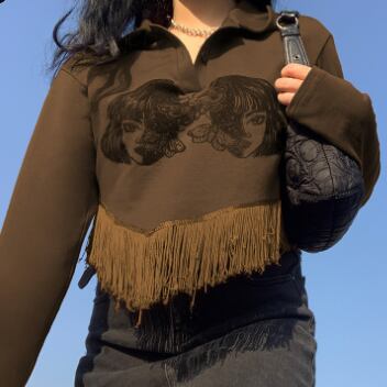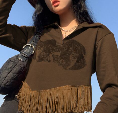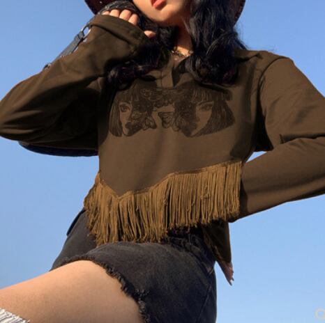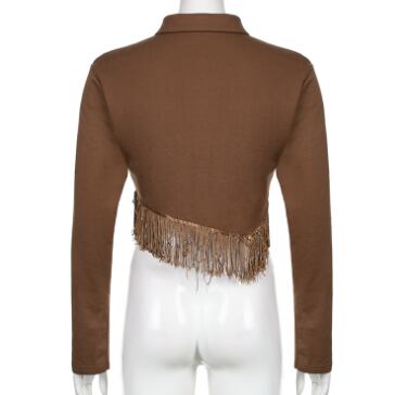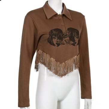 フリンジショート丈トップス ブラウス カットソー ショート丈 長袖 襟付き スリム タイト 細身 フリンジ カウボーイスタイル かわいい 大人可愛い カジュアル かっこいい レトロ 大人女子 マニッシュ ボーイッシュ 個性的 クール 主役級 存在感 無地 柄 春 秋 誕生日 10代 20代 30代 40代 レディース 女性用 ママ 女の子 お出かけ 女子会 休日 イベント お散歩 特徴的 着回し お揃い 双子 ファッション コーデ スタイル モテ プレゼント ギフト 安い 安い お得 目立つ S M