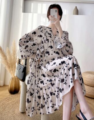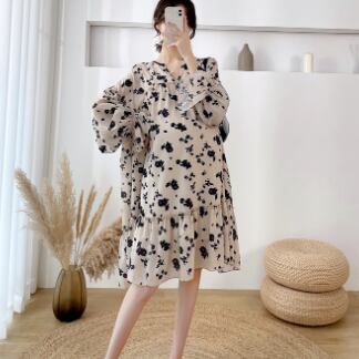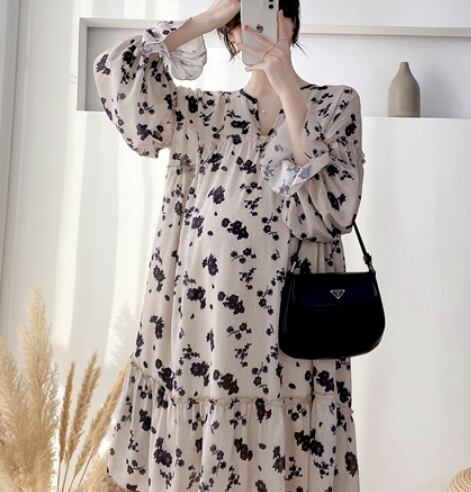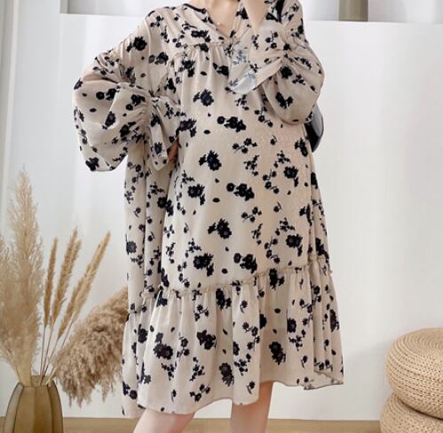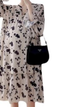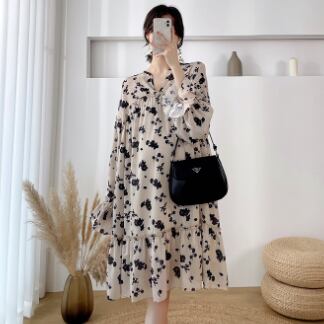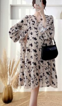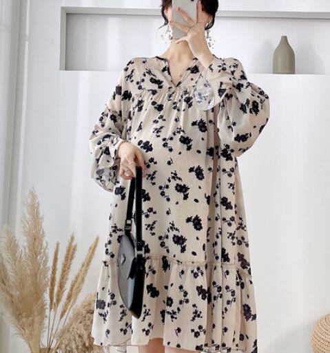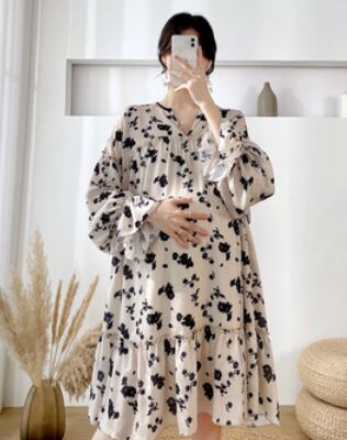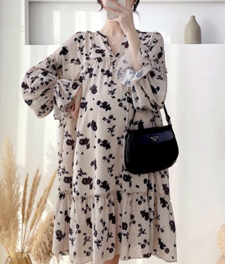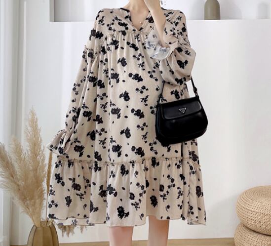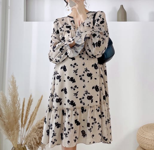 花柄の可愛らしいマタニティドレス、お待たせしました!ひざ丈で肌寒い時期にも着やすい長袖タイプ。フリルが甘さをプラスし、存在感のあるプリント柄で周りと差をつけましょう。
