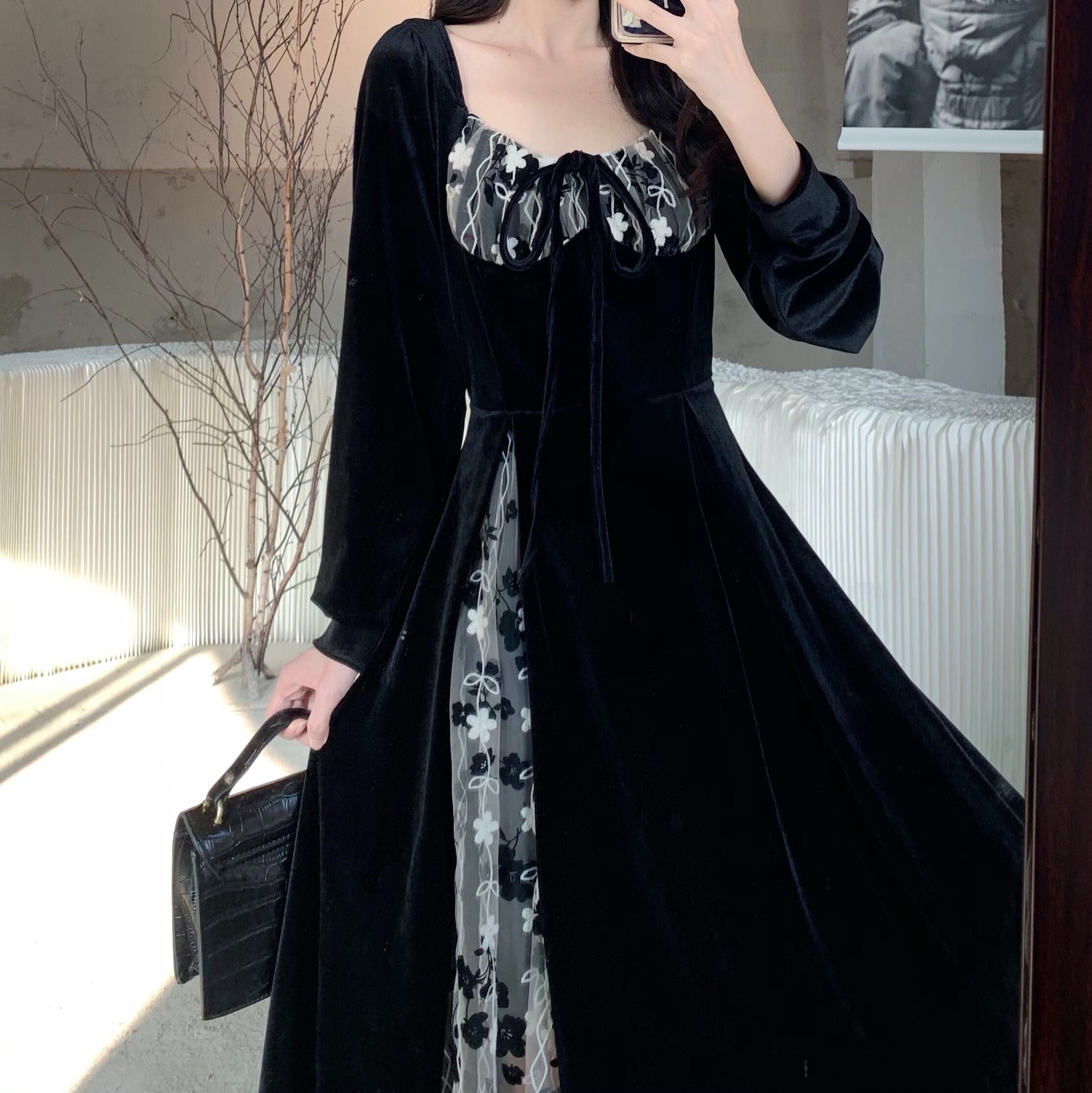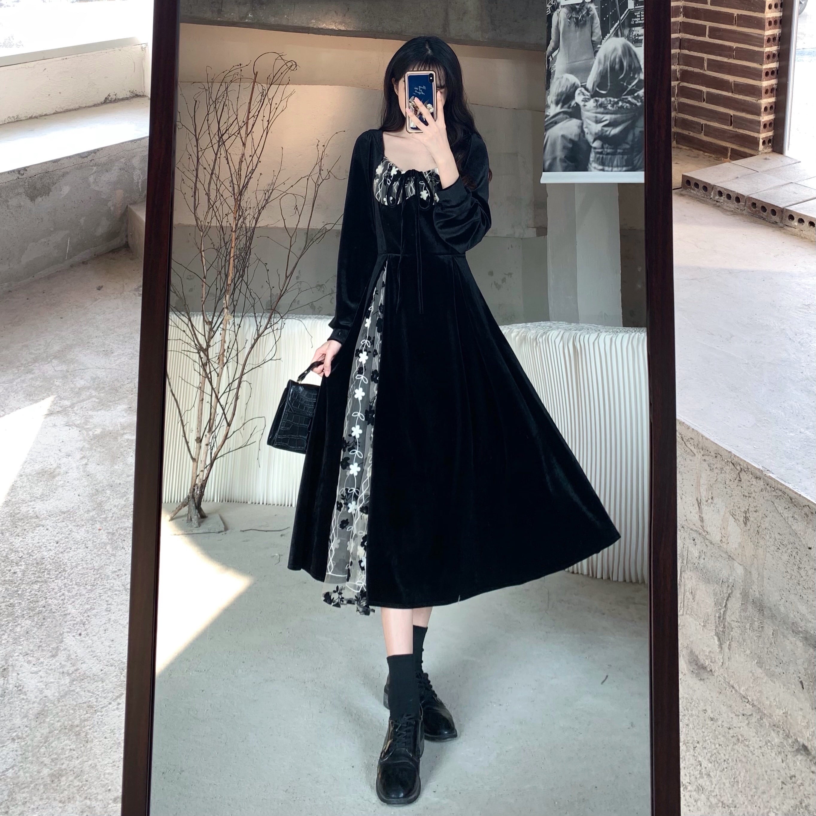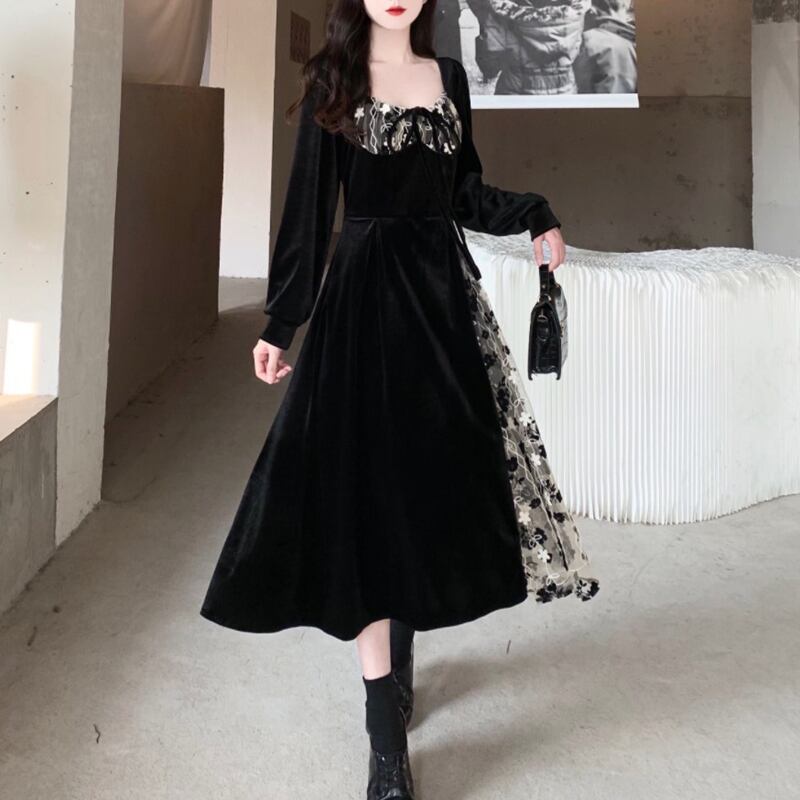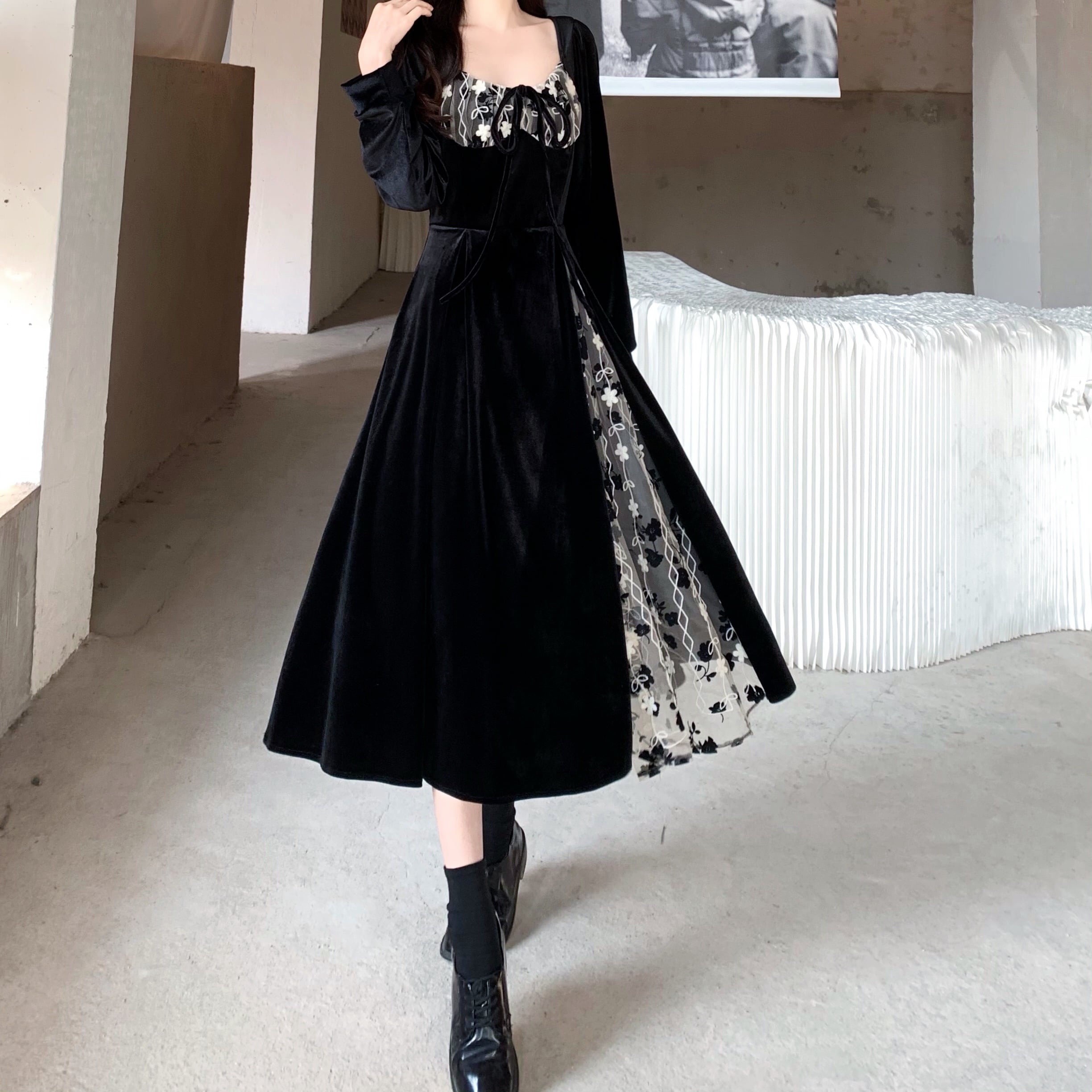 胸元リボン シアーレース切替え 配色 フラワーライン デコルテ魅せ ワンピース ワンピドレス 膝下 ミモレ丈 ミディアム丈 長袖 スクエアネック 襟付き Aライン レース 切り替えデザイン 異素材MIX ベルベット 大人可愛い きれいめ シンプル 上品 おしゃれ 個性的 エレガント 存在感 無地 花柄 春 秋 冬 クリスマス バレンタイン レディース 女性用 ママ デート お出かけ イベント レストラン 韓国系 オルチャン スタイル M L XL 2XL 3XL 4XL 大きいサイズ ブラック