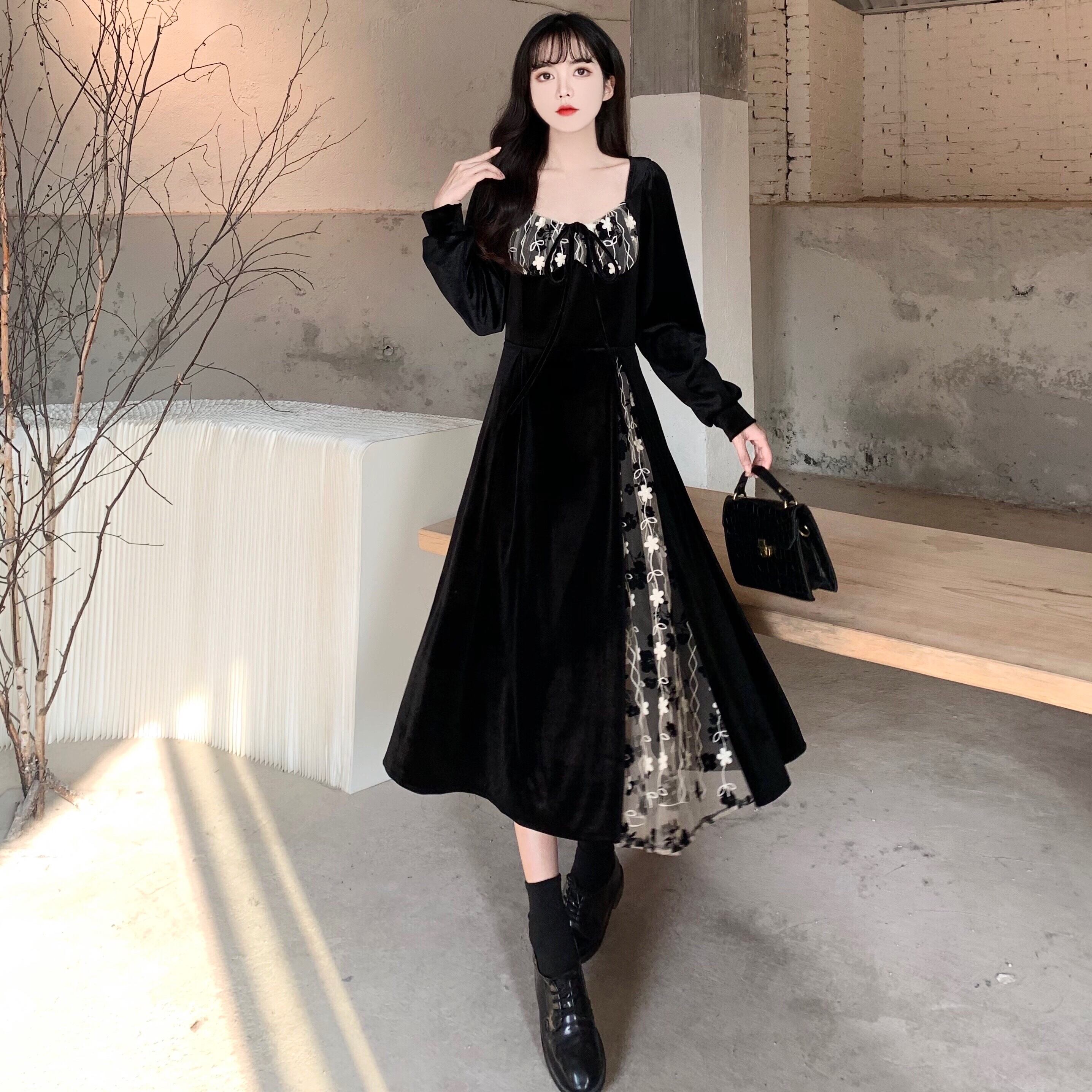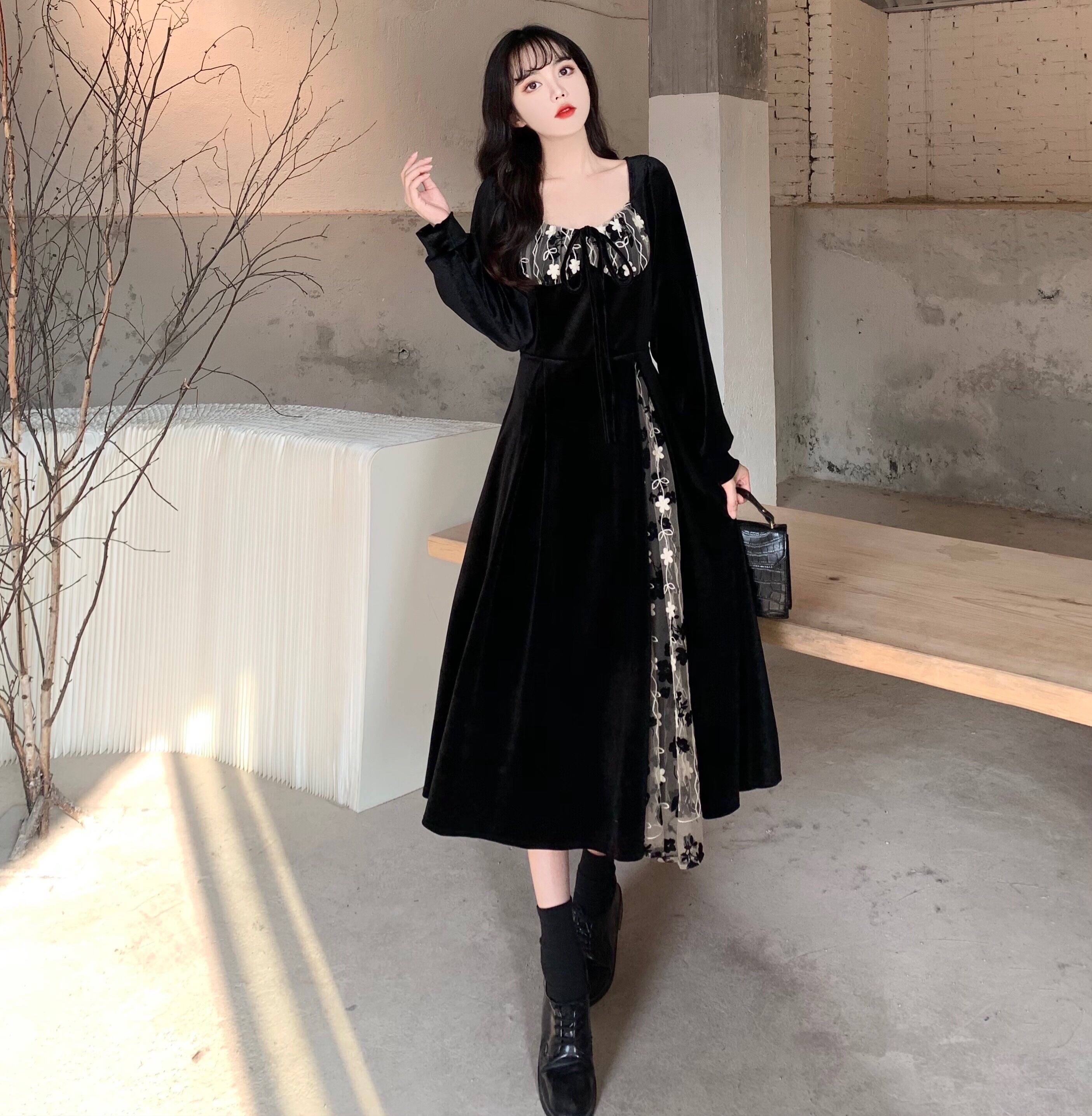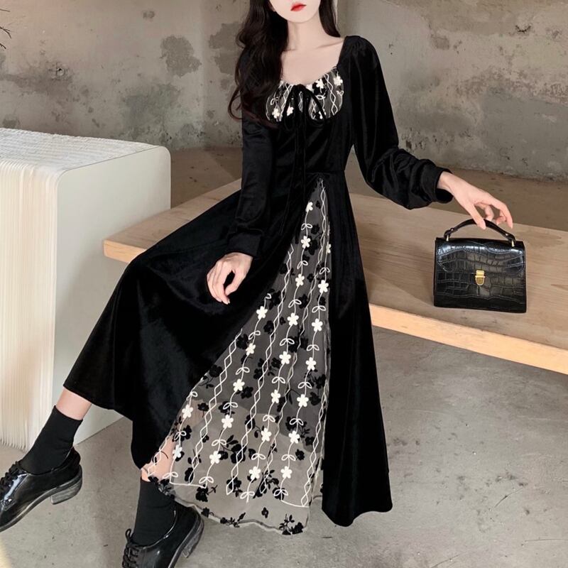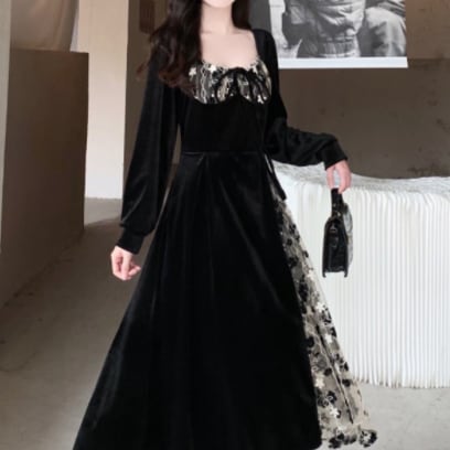 胸元リボン シアーレース切替え 配色 フラワーライン デコルテ魅せ ワンピース ワンピドレス 膝下 ミモレ丈 ミディアム丈 長袖 スクエアネック 襟付き Aライン レース 切り替えデザイン 異素材MIX ベルベット 大人可愛い きれいめ シンプル 上品 おしゃれ 個性的 エレガント 存在感 無地 花柄 春 秋 冬 クリスマス バレンタイン レディース 女性用 ママ デート お出かけ イベント レストラン 韓国系 オルチャン スタイル M L XL 2XL 3XL 4XL 大きいサイズ ブラック