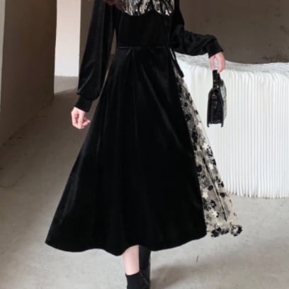 胸元と左サイド寄りのハイスリット部分を透け感のあるレース生地で切り替えた、異素材ミックスデザインのベルベットワンピース。