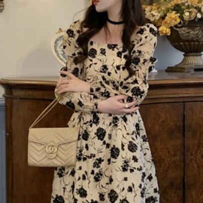 ベージュ地に黒の花模様が大人っぽい、前後スクエアネックデザインのワンピース。