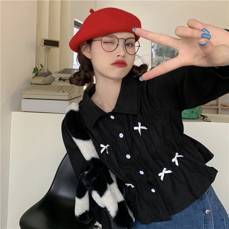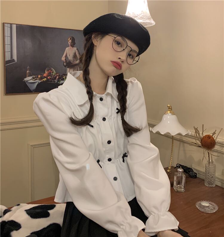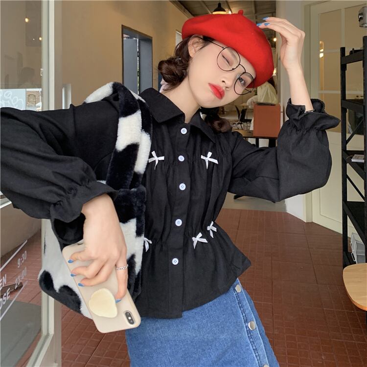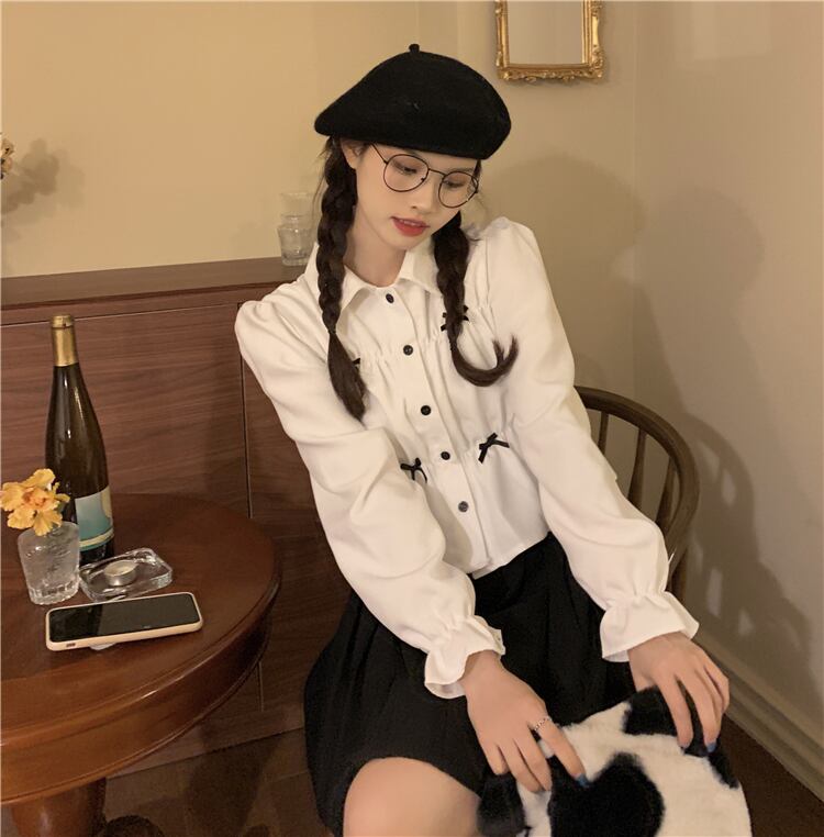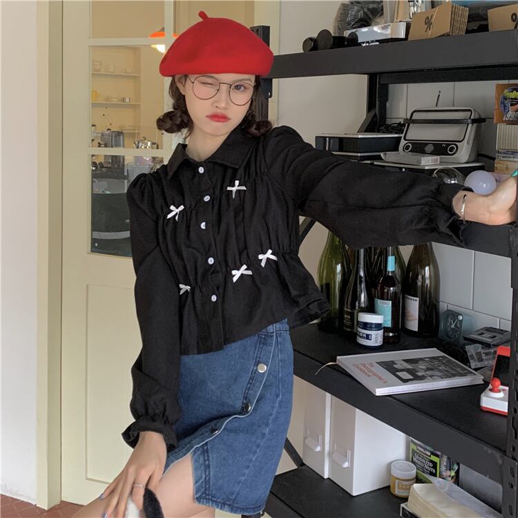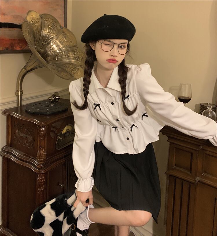 ショート丈シャツ トップス ブラウス スイート ガーリー ラブリー ブラック 黒 ホワイト 白 ショート丈 袖あり 長袖 ボリューム袖 襟付き ストレート シングルブレスト ボタン リボン 大人女子 大人 上品 おしゃれ デイリーウェア レトロ レトロ風 こなれ感 ラフ キュート かわいい 女子 個性的 デザイン 主役級 存在感 無地 春 スプリング 10代 20代 レディース 女性用 学生 通学 デート お出かけ 女子会 着回し 普段使い S M L モノトーン