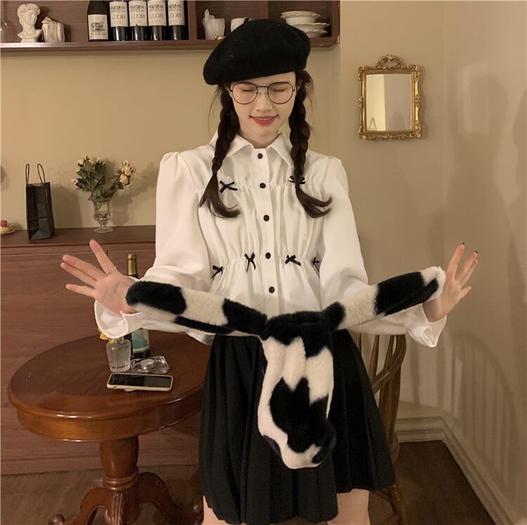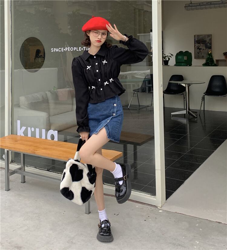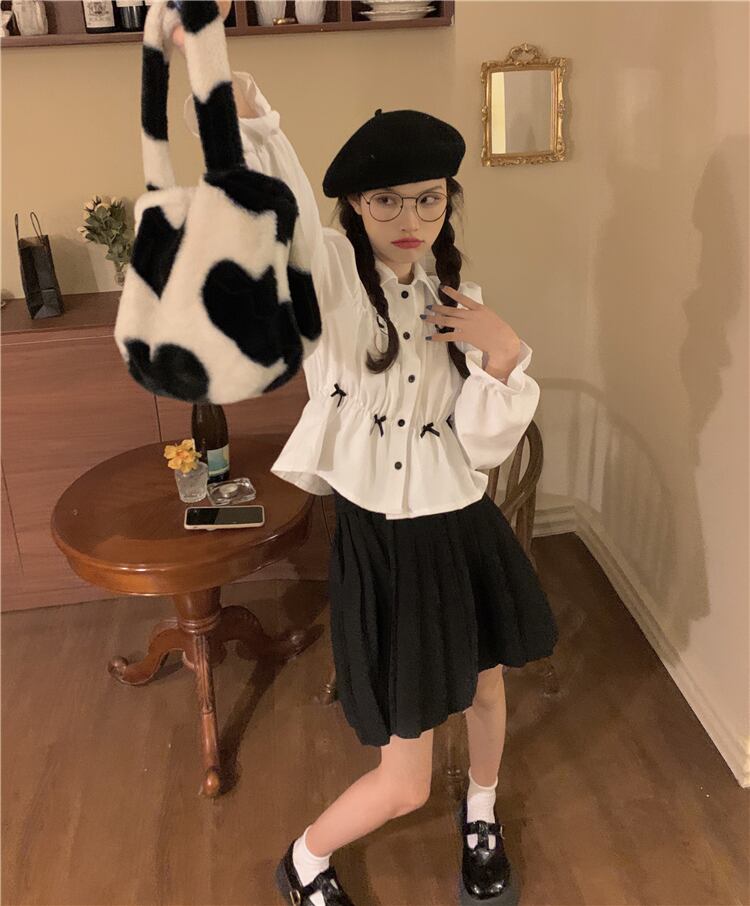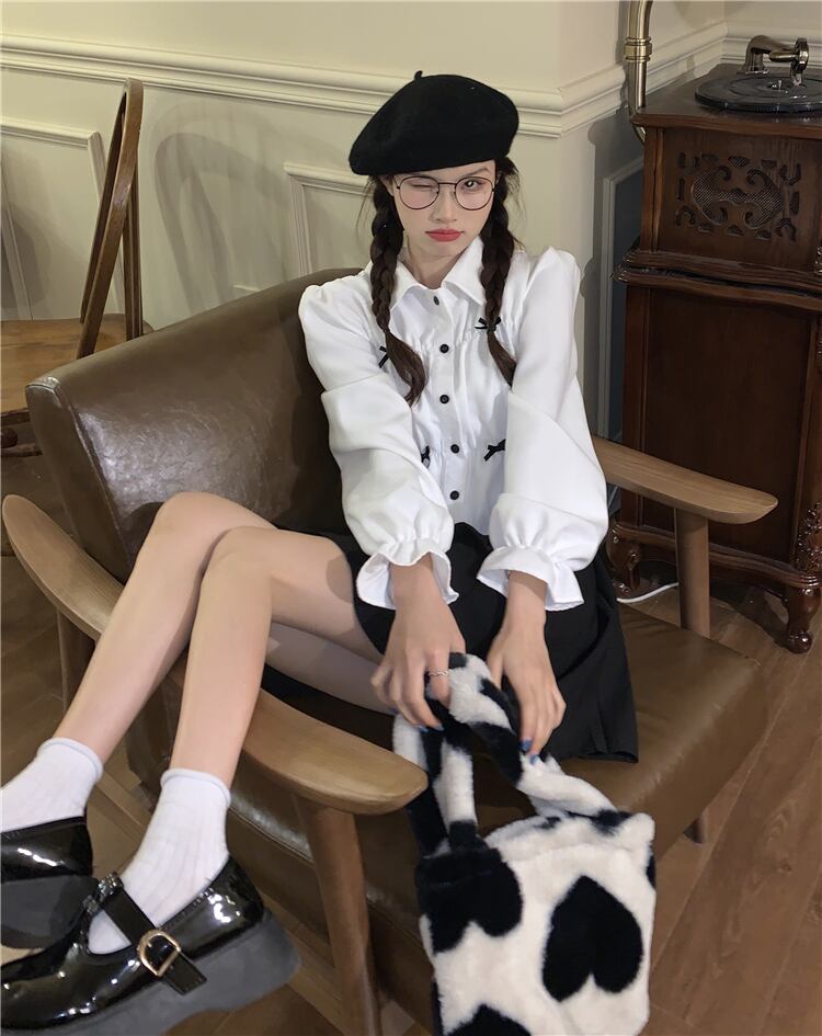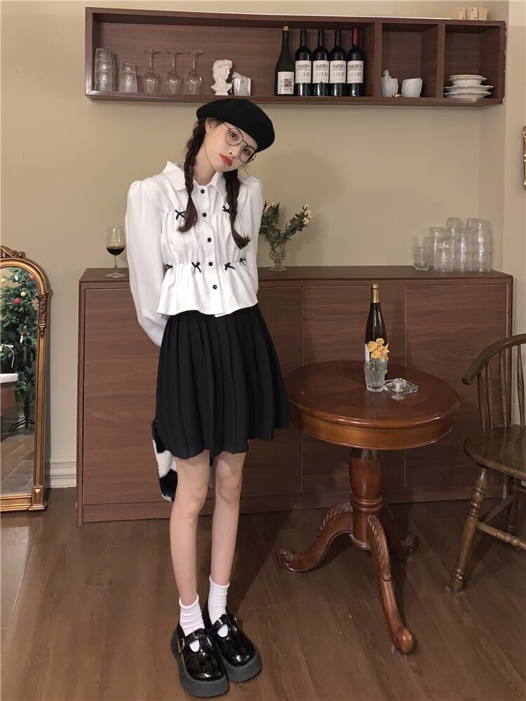 ショート丈シャツ トップス ブラウス スイート ガーリー ラブリー ブラック 黒 ホワイト 白 ショート丈 袖あり 長袖 ボリューム袖 襟付き ストレート シングルブレスト ボタン リボン 大人女子 大人 上品 おしゃれ デイリーウェア レトロ レトロ風 こなれ感 ラフ キュート かわいい 女子 個性的 デザイン 主役級 存在感 無地 春 スプリング 10代 20代 レディース 女性用 学生 通学 デート お出かけ 女子会 着回し 普段使い S M L モノトーン