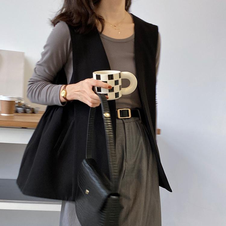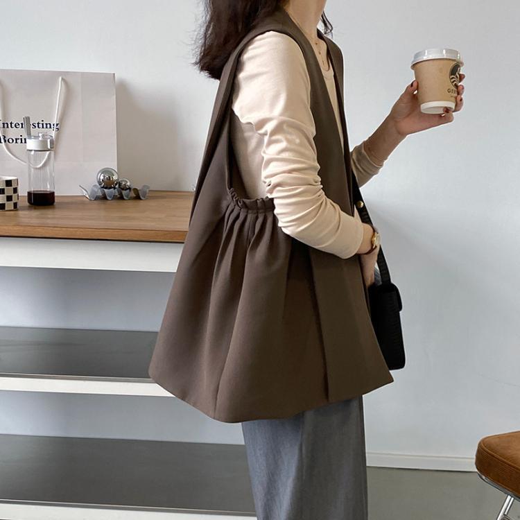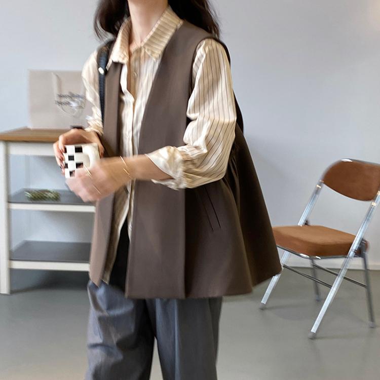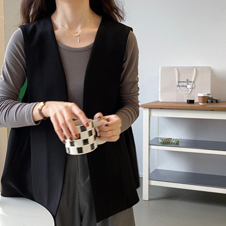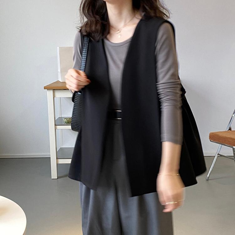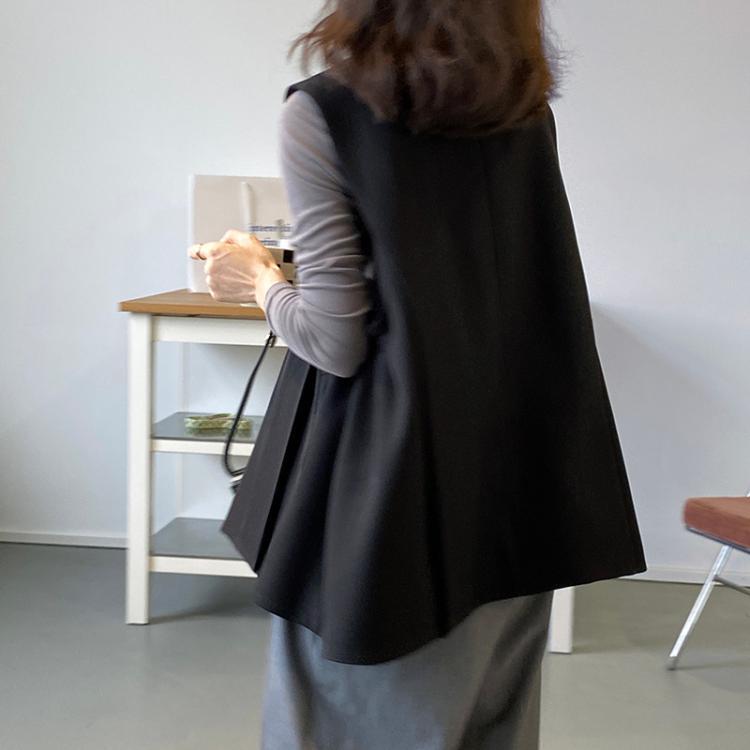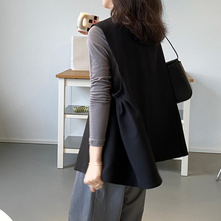このデザインベストは、シンプルで上品なデザインが特徴です。ブラックとブラウンの2種類のカラーがあり、トップスに重ね着するだけでおしゃれなコーディネートが完成します。スリムで細身のシルエットで、女性らしい雰囲気が漂います。春はかわいらしく、秋冬は大人っぽくスタイリングできる万能アイテムです。