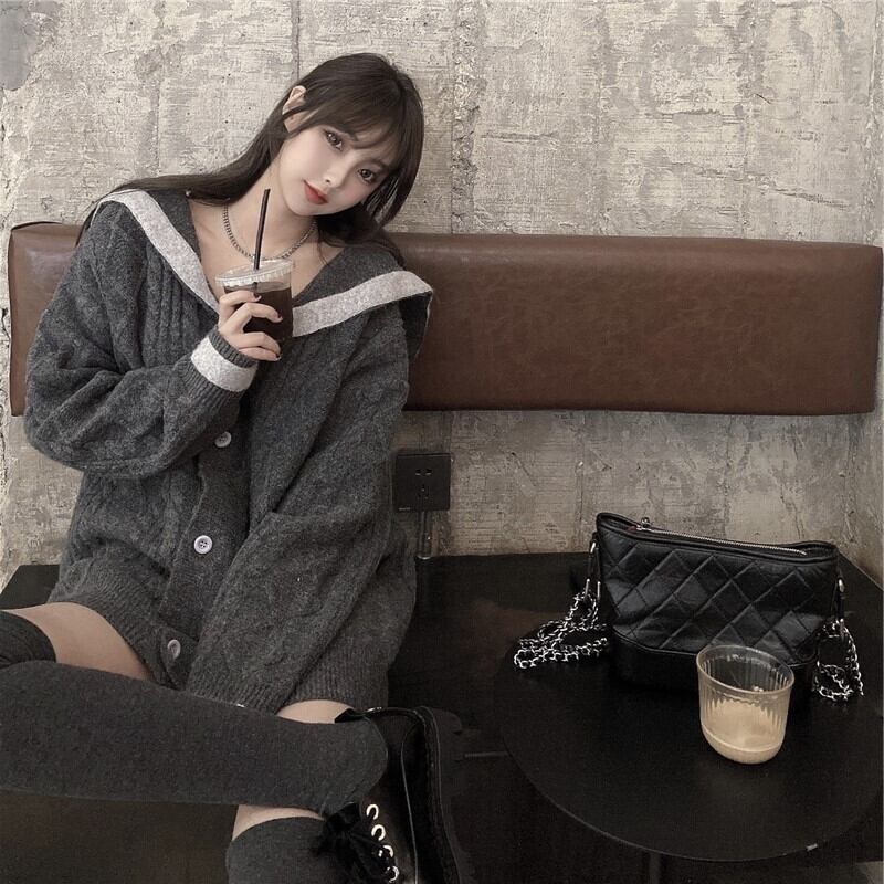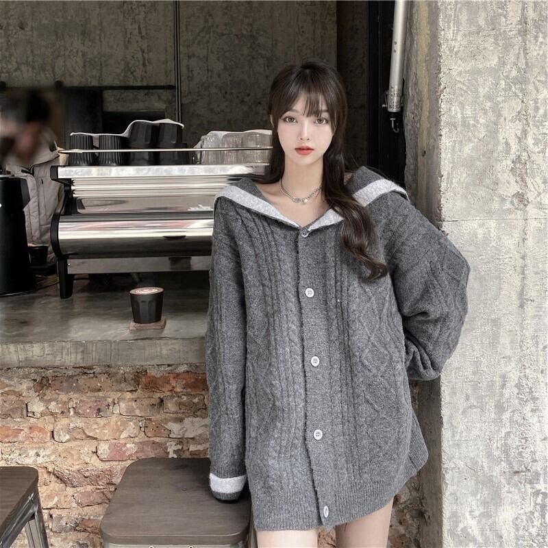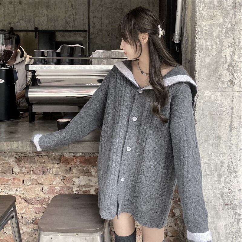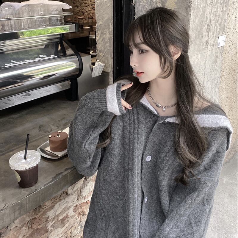 オーバーサイズ 配色ライン入り セーラーカラー ダイヤ編み切り替え チュニック丈 トップス セーター カーディガン 長袖 ドロップショルダー 萌袖 Vネック 襟付き ケーブルニット ポリエステル ニット 大人可愛い きれいめ シンプル カジュアル 上品 おしゃれ こなれ感 存在感 春 秋 冬 レディース 女性用 女の子 学生 通学 デート お出かけ 休日 着回し 普段使い 重ね着 韓国系 オルチャン ファッション コーデ 体系カバー L XL 2XL 大きいサイズ ゆったり ゆる サイズ グレー