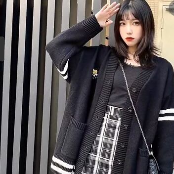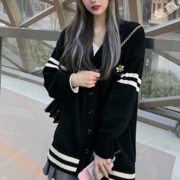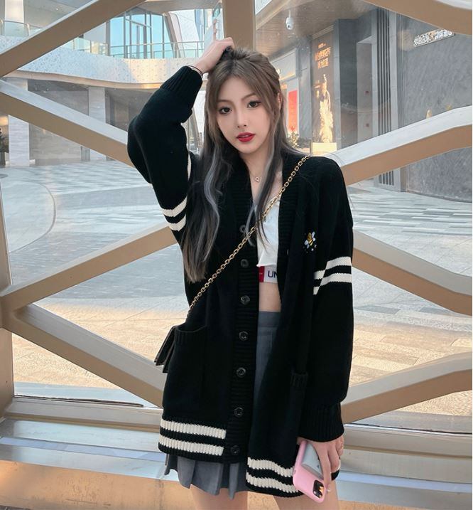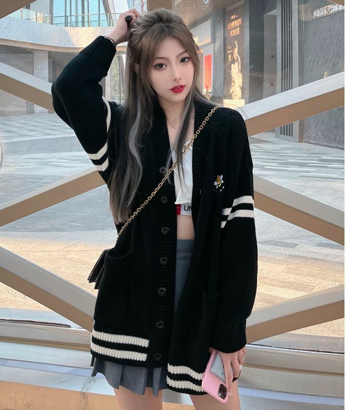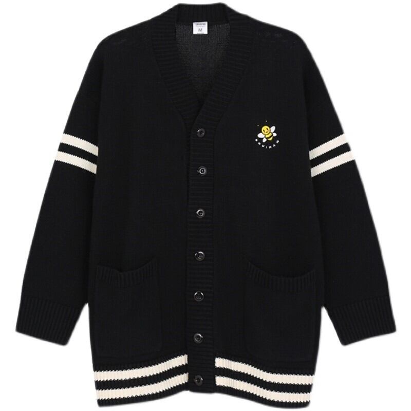 ハニービーニットカーデガン アウターミドル丈 袖あり 長袖 Vネック イージー 前開き ボタン ウール カシミヤ かわいい 大人可愛い カジュアル おしゃれ お洒落 かっこいい レトロ ラフ ラブリー キュート ガーリー ルーズ 個性的 存在感 ストライプ みつばち柄 春 秋 10代 20代 レディース 女性用 OL 学生 通学 デート お出かけ 公園デビュー 女子会 休日 アウトドア 旅行 着回し ファッション コーデ スタイル 楽ちん 暖かい モテ プレゼント 新作 トレンド 流行 インスタ映え