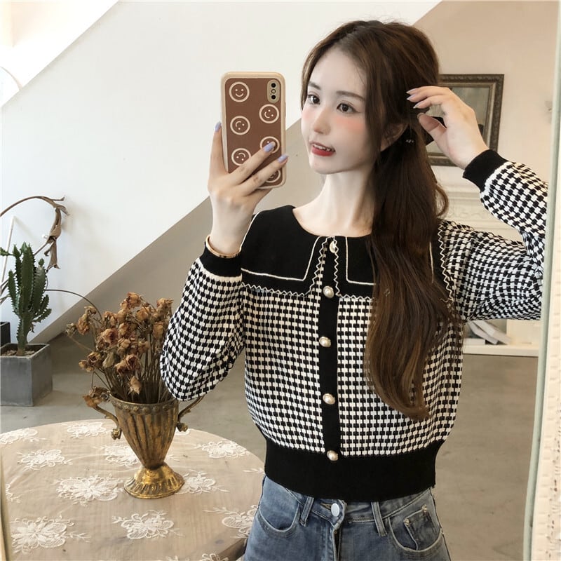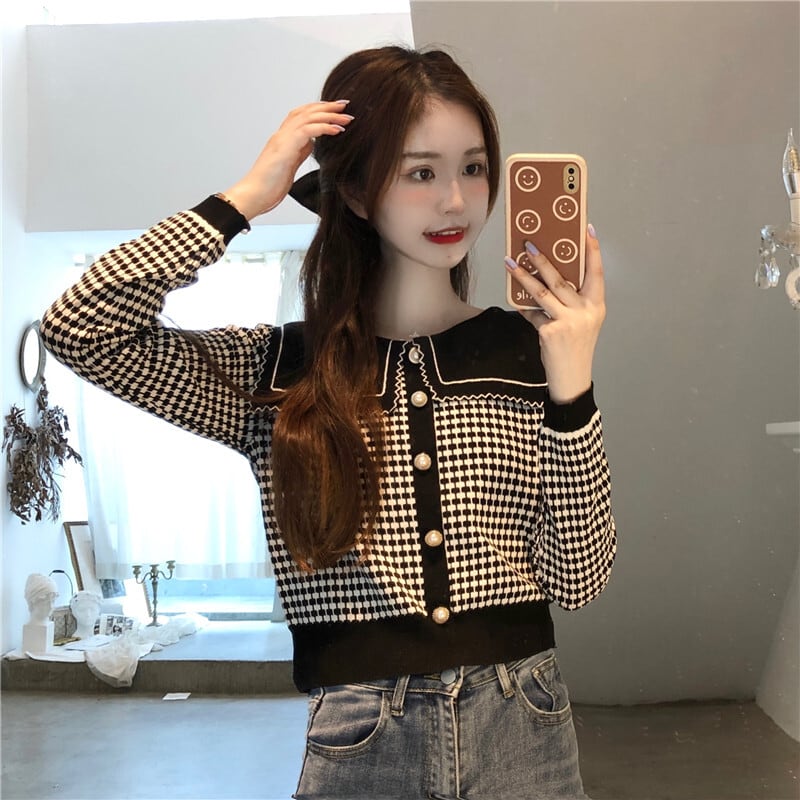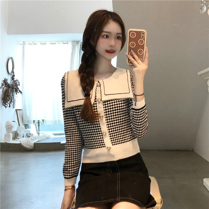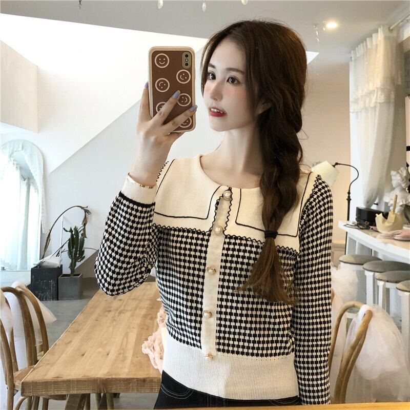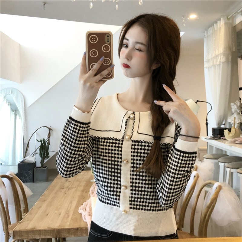 ビックカラー 大きめ襟 配色ライン入り パール調ボタン 細めさん向け トップス ニットソー セーター プルオーバー ショート丈 長袖 ラウンドネック 襟付き 細身 スマート ニット かわいい 大人可愛い きれいめ シンプル カジュアル 上品 おしゃれ お洒落 レトロ フェミニン ガーリー 大人女子 チェック柄 春 秋 レディース 女性用 女の子 OL 通勤 学生 通学 デート お出かけ 女子会 休日 普段使い 韓国系 オルチャン コーデ スタイル 脚長 トレンド 新作 白 ホワイト 黒 ブラック
