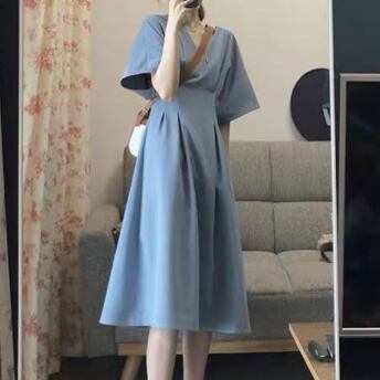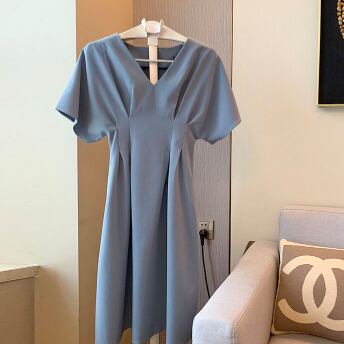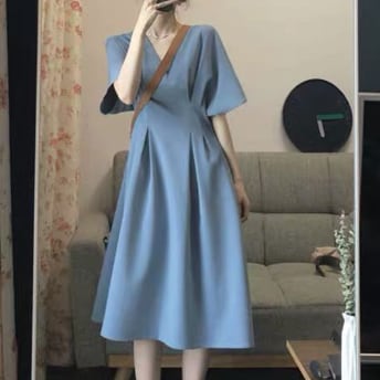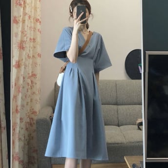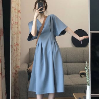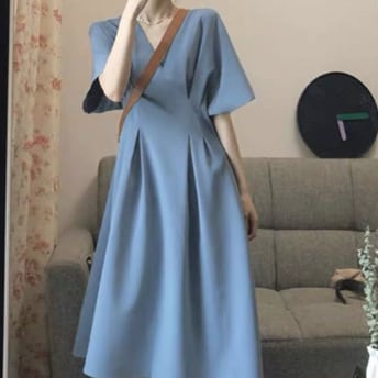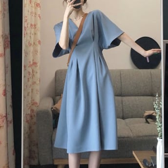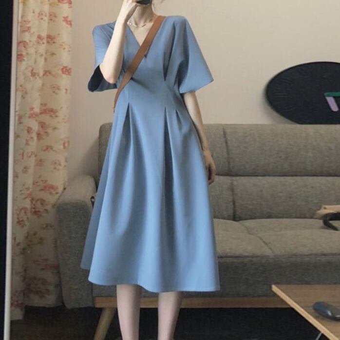 ワンピース ドレス 膝下 半袖 Vネック フレア かわいい 大人可愛い きれいめ 大人 上品 おしゃれ お洒落 大人可愛い 大人女子 キュート ガーリー エレガント 主役級 存在感 フォーマル 春 夏 結婚式 二次会 披露宴 10代 20代 30代 40代 レディース 女性用 ママ 女の子 パーティー イベント 着回し 韓国 韓国系 オルチャン ファッション コーデ スタイル モテ 新作 定番 送料無料 トレンド 流行 ハイウエスト ウエストマーク スタイルアップ くすみブルー 着痩せ 体型カバー 大人