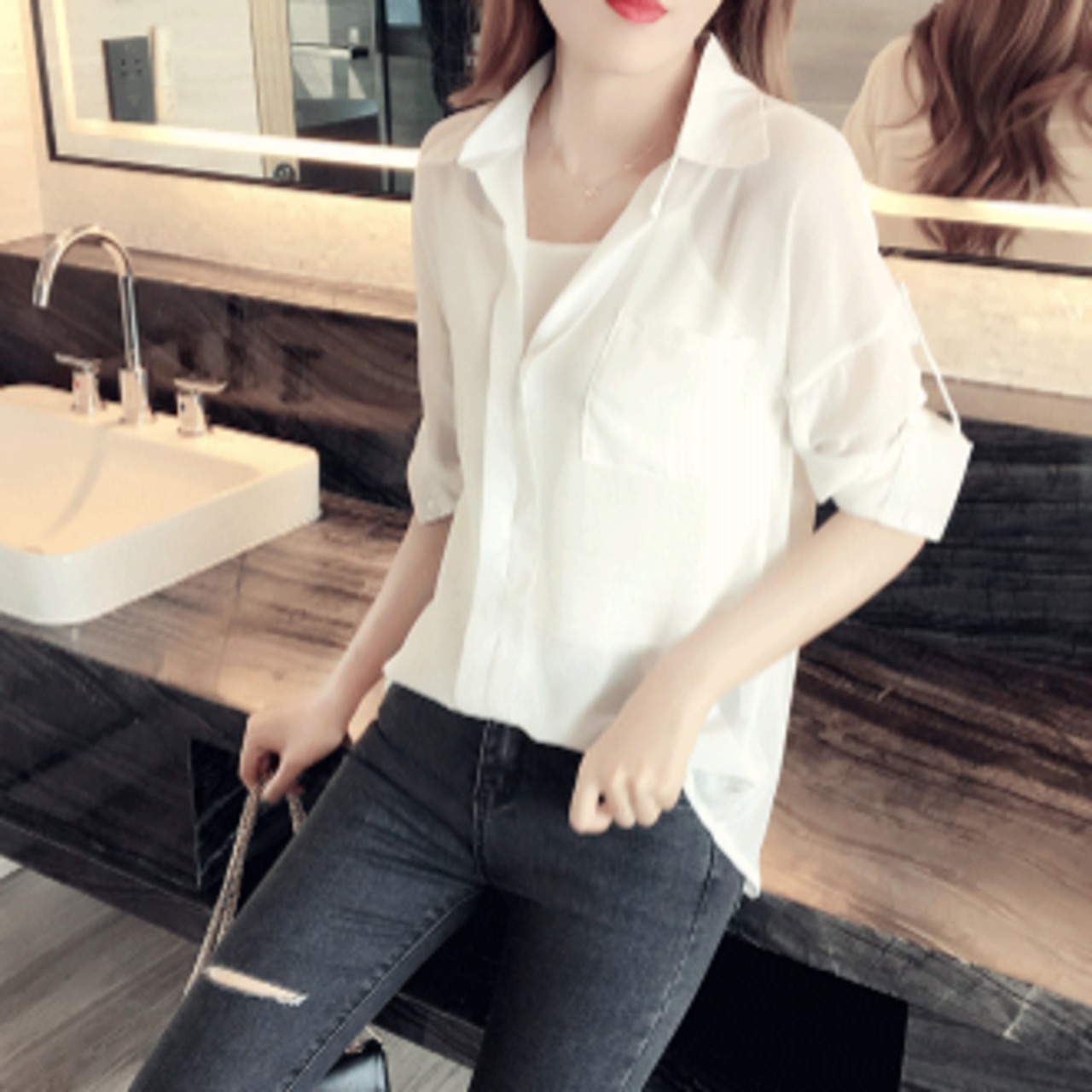 エレガントで大人カジュアルにもぴったりなVネックシャツ。透け感があるシースルーシフォン素材を使用した、女性らしい上品さが特徴です。一枚でコーデが決まる優秀アイテムで、着る人によってさまざまな着こなしが楽しめます。ジーンズ、スカート、ショーパン、あらゆるボトムスに合わせやすく、様々なシーンで活躍してくれます。