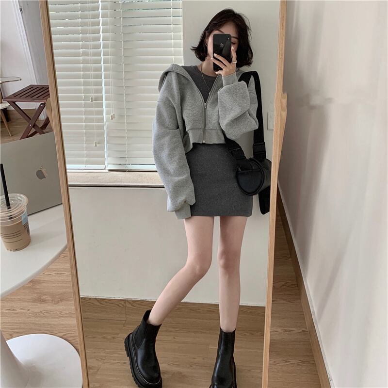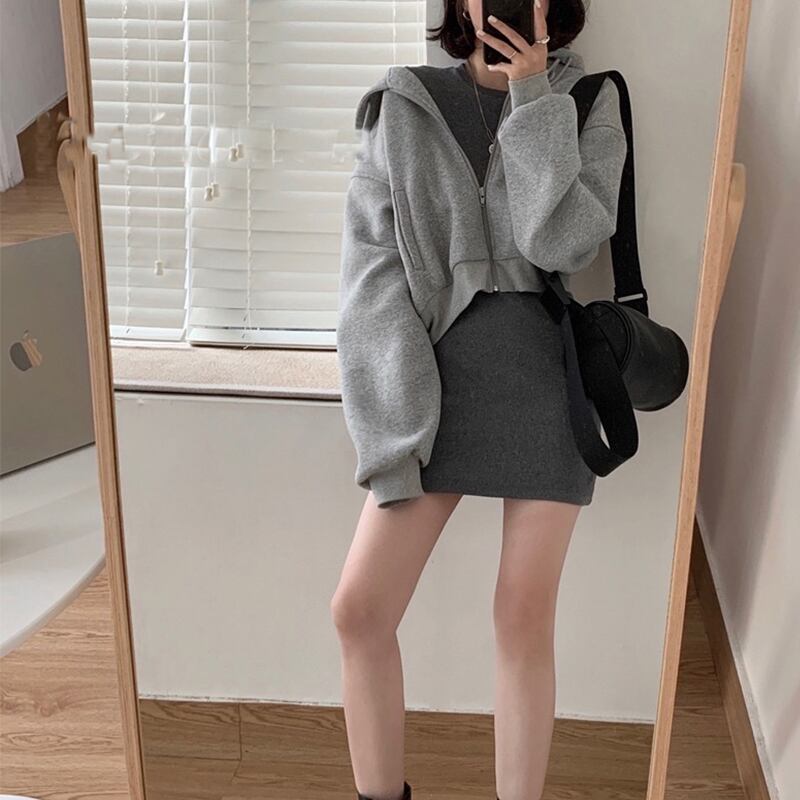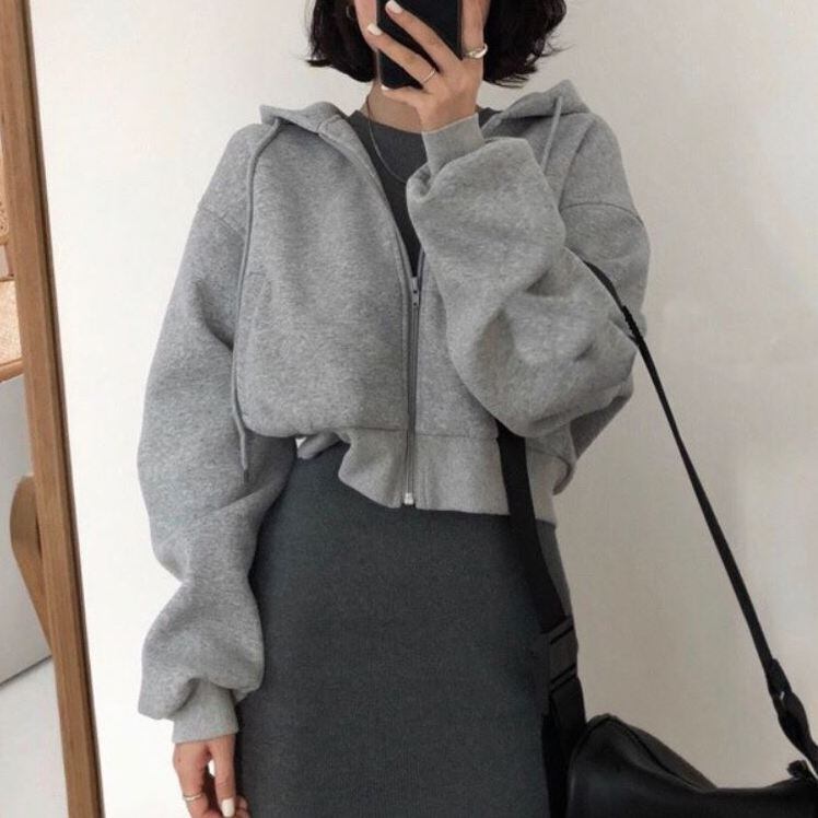 ジップアップ クロップド 羽織り トップス プルオーバー パーカー フーディー ショート丈 長袖 ドロップショルダー フード付き ファスナー ポケット 綿 かわいい 大人可愛い シンプル カジュアル 上品 おしゃれ かっこいい 大人女子 こなれ感 クール 無地 春 秋 冬 レディース 女性用 ママ 女の子 学生 通学 デート お出かけ 公園デビュー 休日 着回し 普段使い 重ね着 韓国系 オルチャン コーデ 楽ちん 脚長 トレンド S M L XL ゆったり サイズ 黒 ブラック 灰色 グレー