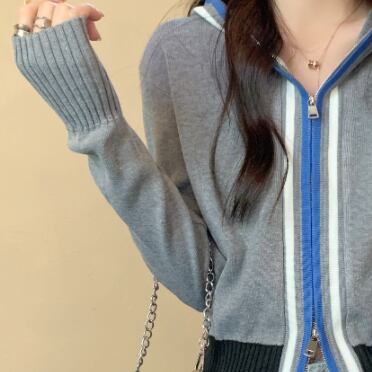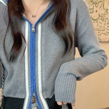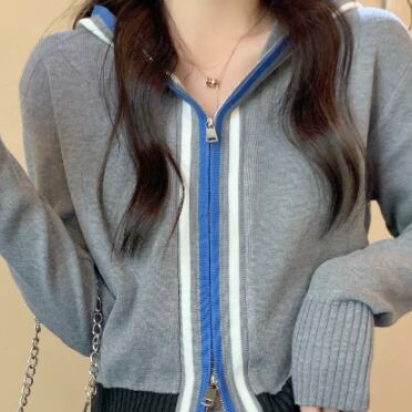 コントラストカラーが個性的なフード付きジップアップニットカーディガンです。