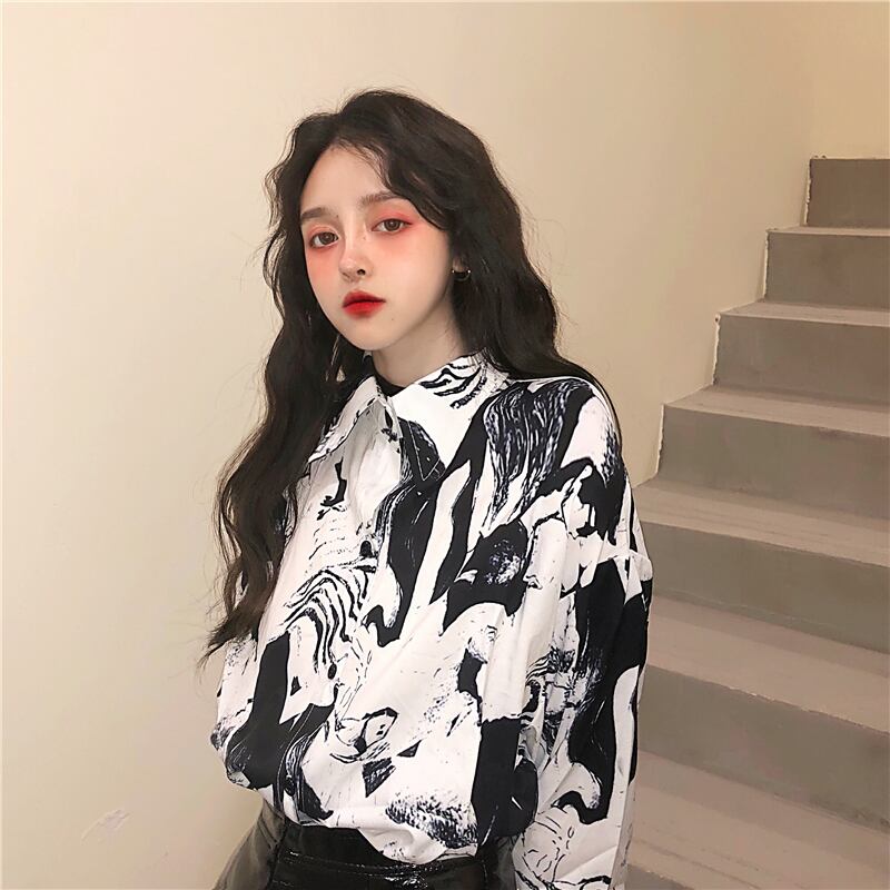 デザインシャツ トップス ブラウス カジュアル ブラック 黒 レギュラー丈 袖あり 長袖 襟付き ストレート シングルブレスト ボタン 大人女子 大人 上品 おしゃれ かっこいい クール デイリーウェア レトロ レトロ風 こなれ感 ラフ ルーズ シルエット 個性的 デザイン 主役級 存在感 柄 配色 春 スプリング 秋 オータム 10代 20代 30代 レディース 女性用 オフィス ビジネス OL 学生 通学 着回し 普段使い ファッション コーデ S M L モノトーン