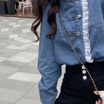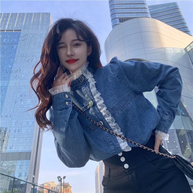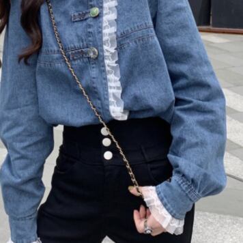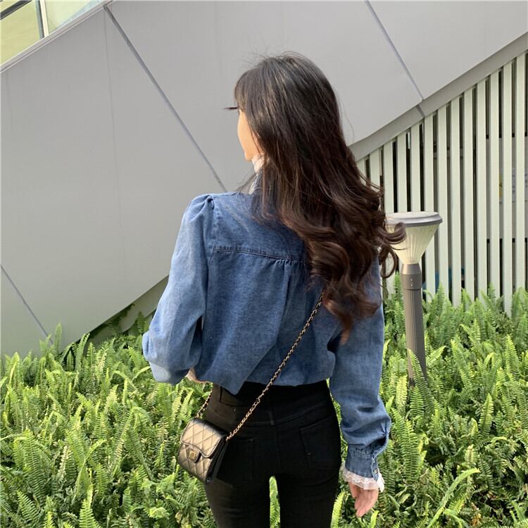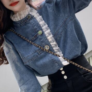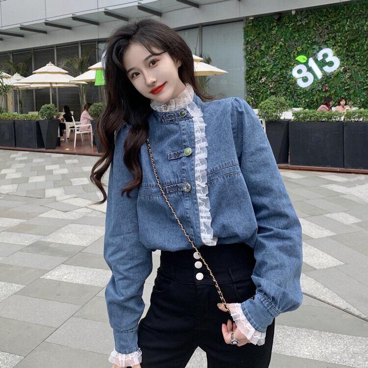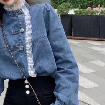 デニムシャツ トップス シャツ クラシック ブルー 青 レギュラー丈 袖あり 長袖 スタンドカラー ストレート ボタン レース 大人女子 大人 上品 おしゃれ きれいめ シンプル デイリーウェア エレガント レトロ レトロ風 こなれ感 ラフ キュート かわいい 女子 個性的 デザイン 主役級 存在感 無地 春 スプリング 10代 20代 30代 レディース 女性用 学生 通学 デート お出かけ 女子会 着回し 普段使い ファッション コーデ ワンサイズ