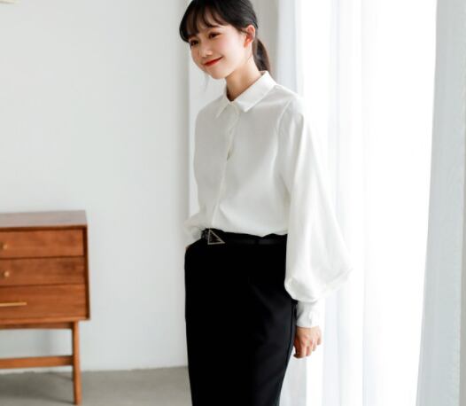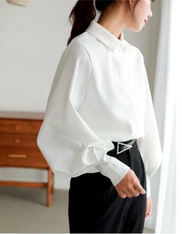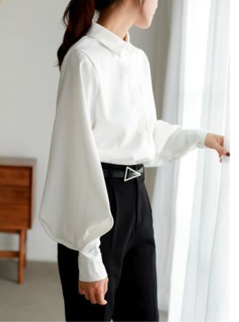 ボリューム袖シャツは、モダンなシルエットが魅力の一枚。袖口にかかるドレープ感が、大人女子の上品さを演出してくれます。襟付きで、トップス感覚で着こなせるのもポイント。レギュラー丈で合わせるボトムを選ばないので、着回しもしやすいです。