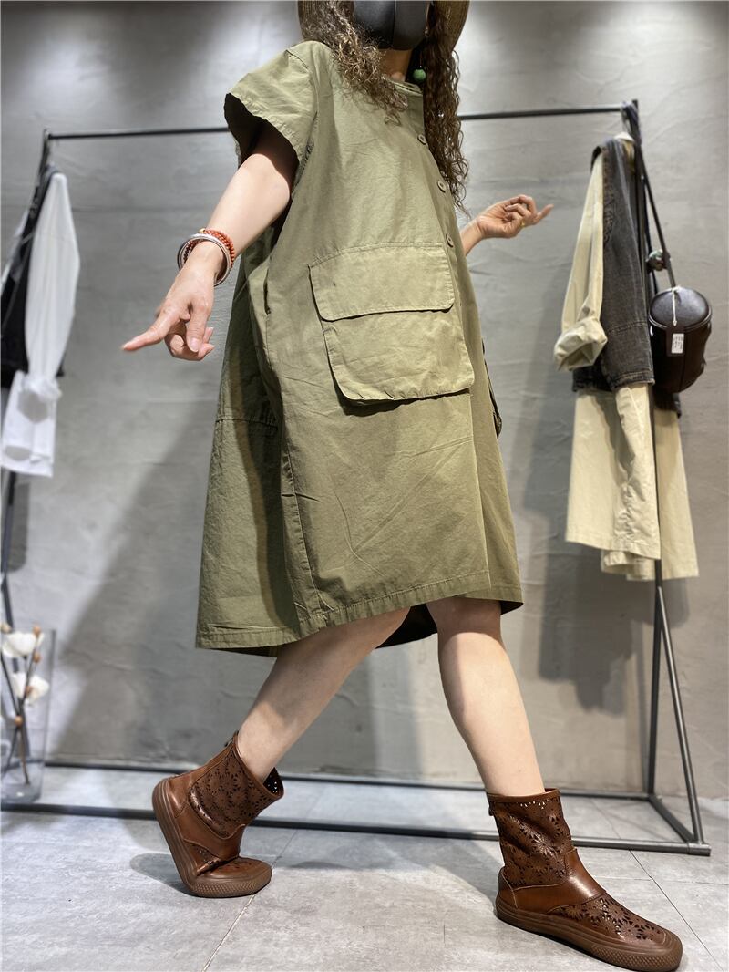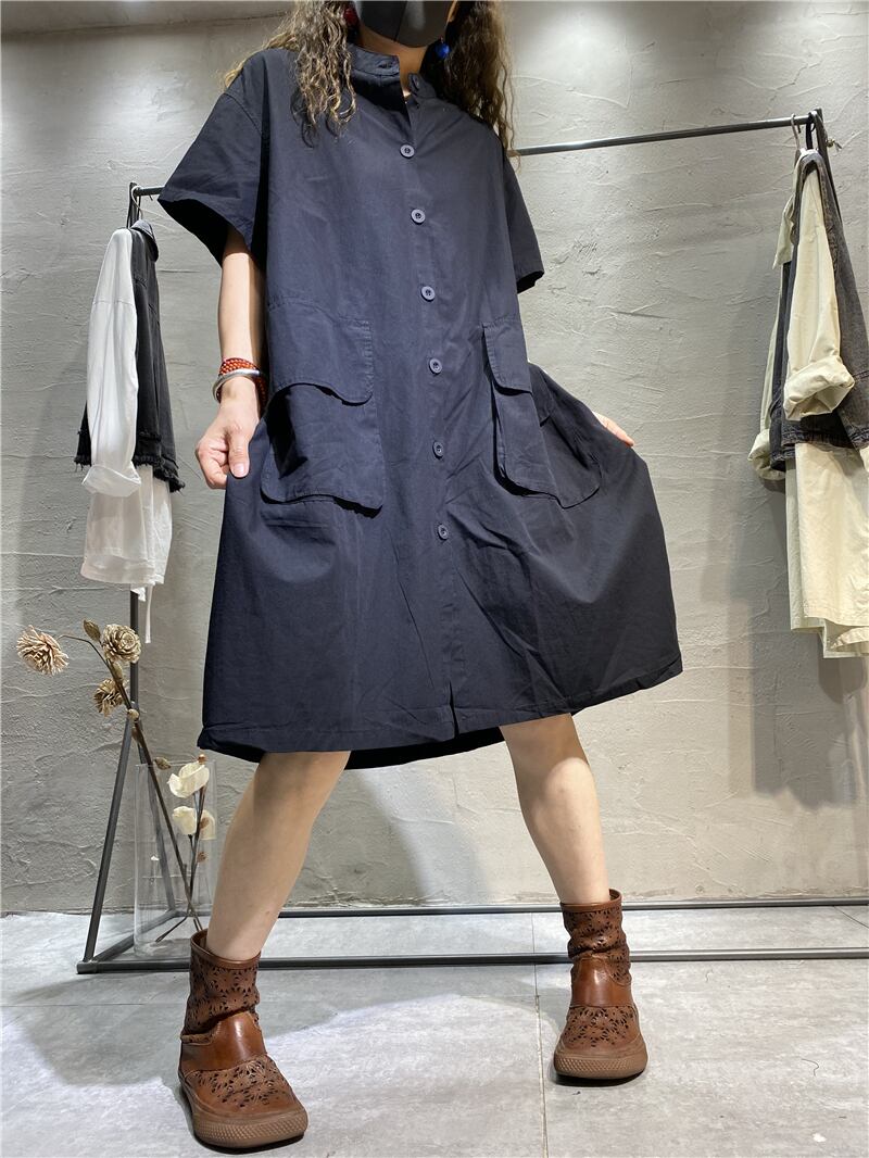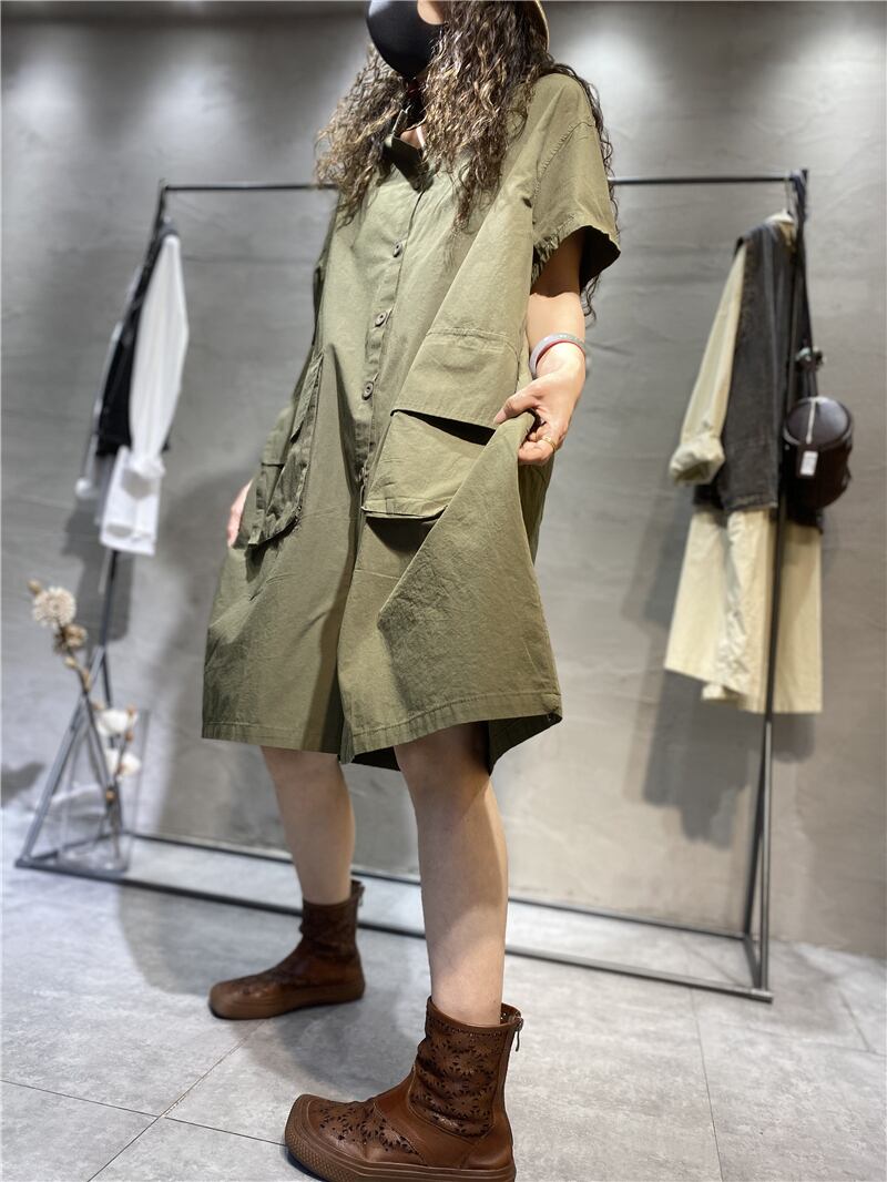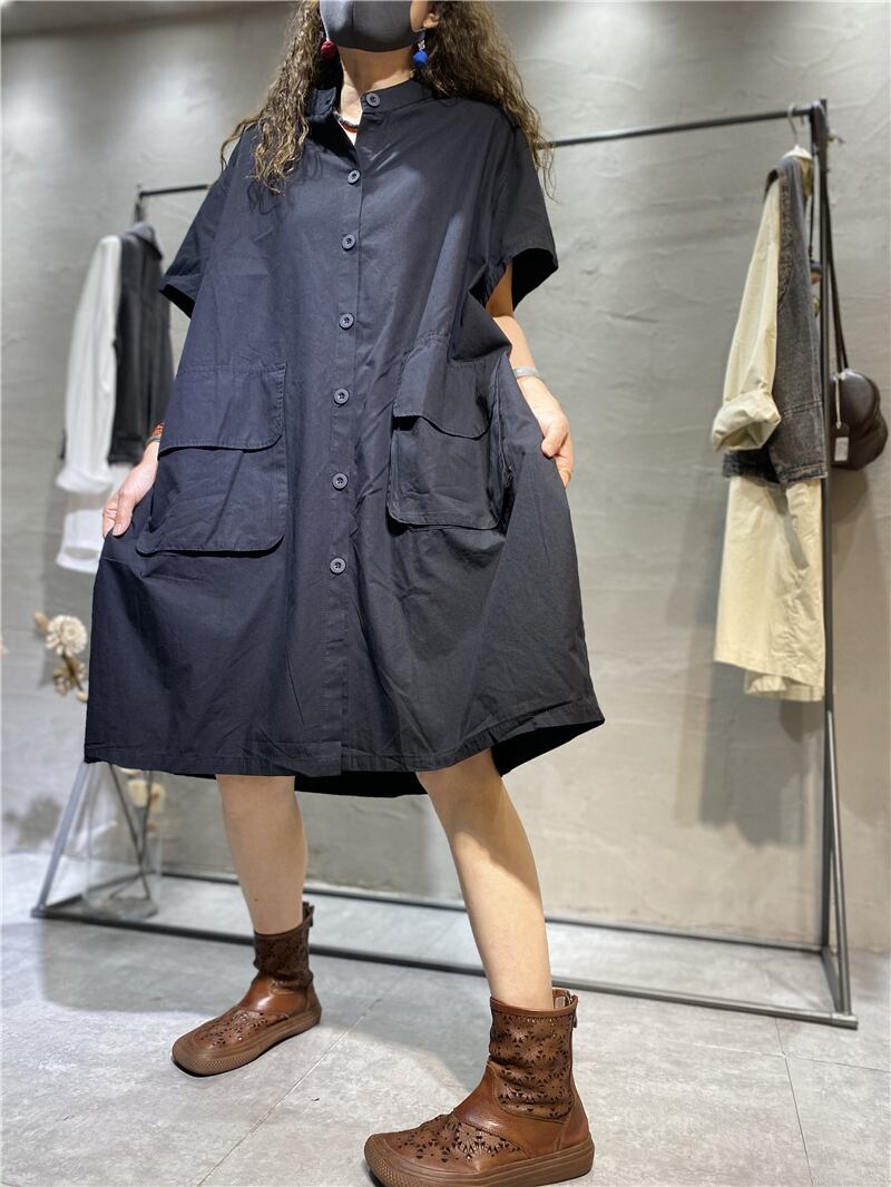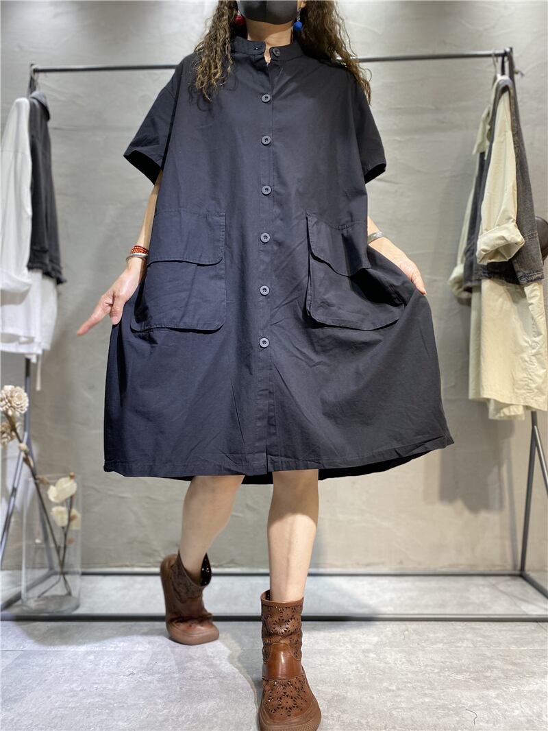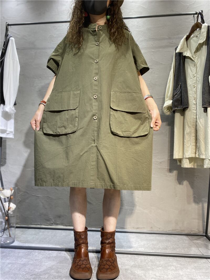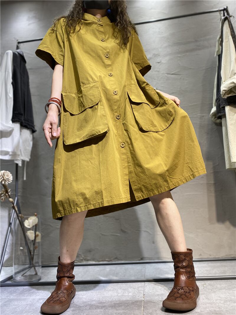 シャツワンピース トップス ワンピ カジュアル ブラック 黒 グリーン 緑 イエロー 黄色 ミディアム丈 袖あり 半袖 スタンドカラー Aライン シングルブレスト ボタン ポケット 綿 コットン 大人女子 大人 上品 おしゃれ デイリーウェア レトロ レトロ風 こなれ感 ラフ ルーズ シルエット 個性的 デザイン 主役級 存在感 無地 夏 サマー 10代 20代 30代 レディース 女性用 学生 通学 デート お出かけ 女子会 着回し 普段使い トレンド ワンサイズ