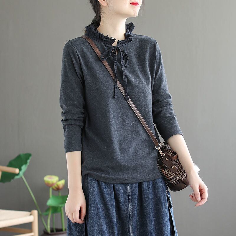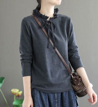 上品なフリルとリボンがポイントのカットソーは、大人可愛いスタイルにぴったり。ハイネックが上品な印象を与え、長袖となっているため、春秋トップスとして重宝します。無地でシンプルなデザインなので、どんなボトムスにも合わせやすく、着回しの効くアイテムです。レトロ感あふれるデザインなので、10代から50代の女性、ママにもおすすめです。