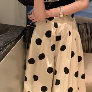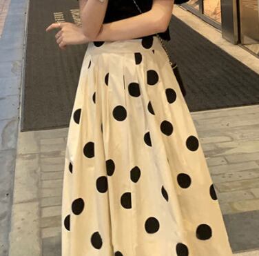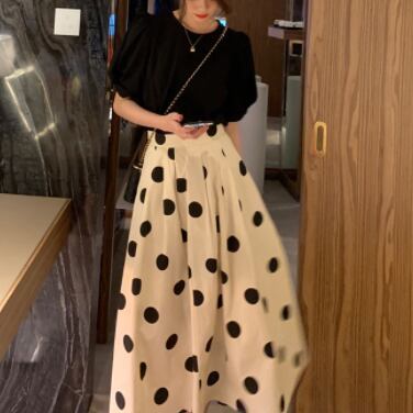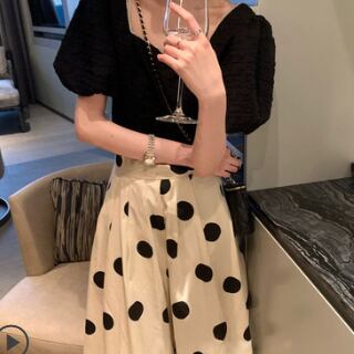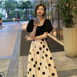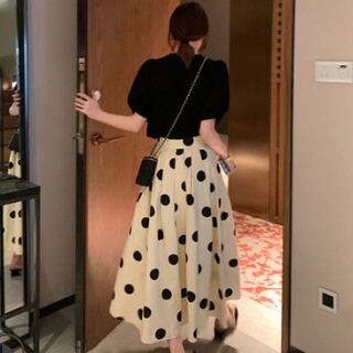 トップスとスカートの上下セットで、コーディネートが簡単!スクエアネックが女性らしいトップスはフレア袖でガーリーな印象に。ミディアム丈のスカートは、ふんわりとしたフレアシルエットが可愛らしく、腰にはゴムが入っているので楽に着用していただけます。黒のドット柄が、レトロ感とキュートさをプラス。大人女子や学生さん、どんな年代の女性にもおすすめです。夏には半袖でさわやかに、秋冬はトップスにカーディガンを合わせて着回し力もバツグンです!