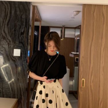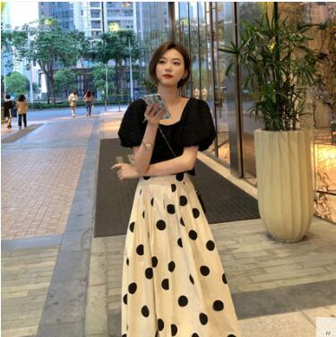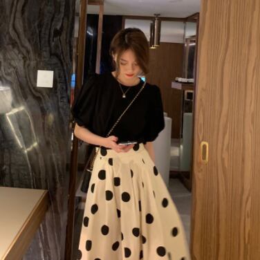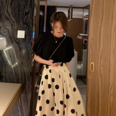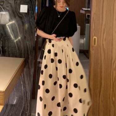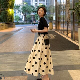 セットアップ トップス スカート Tシャツ スイート ガーリー ブラック 黒 ミディアム丈 袖あり 半袖 スクエアネック フレア 上下セット ツーピース 大人女子 大人 上品 おしゃれ レトロ レトロ風 こなれ感 ラフ キュート かわいい 女子 個性的 デザイン 主役級 存在感 柄 ドット柄 水玉 夏 サマー 10代 20代 レディース 女性用 学生 通学 デート お出かけ 女子会 着回し 普段使い ファッション コーデ S M L XL モノトーン
