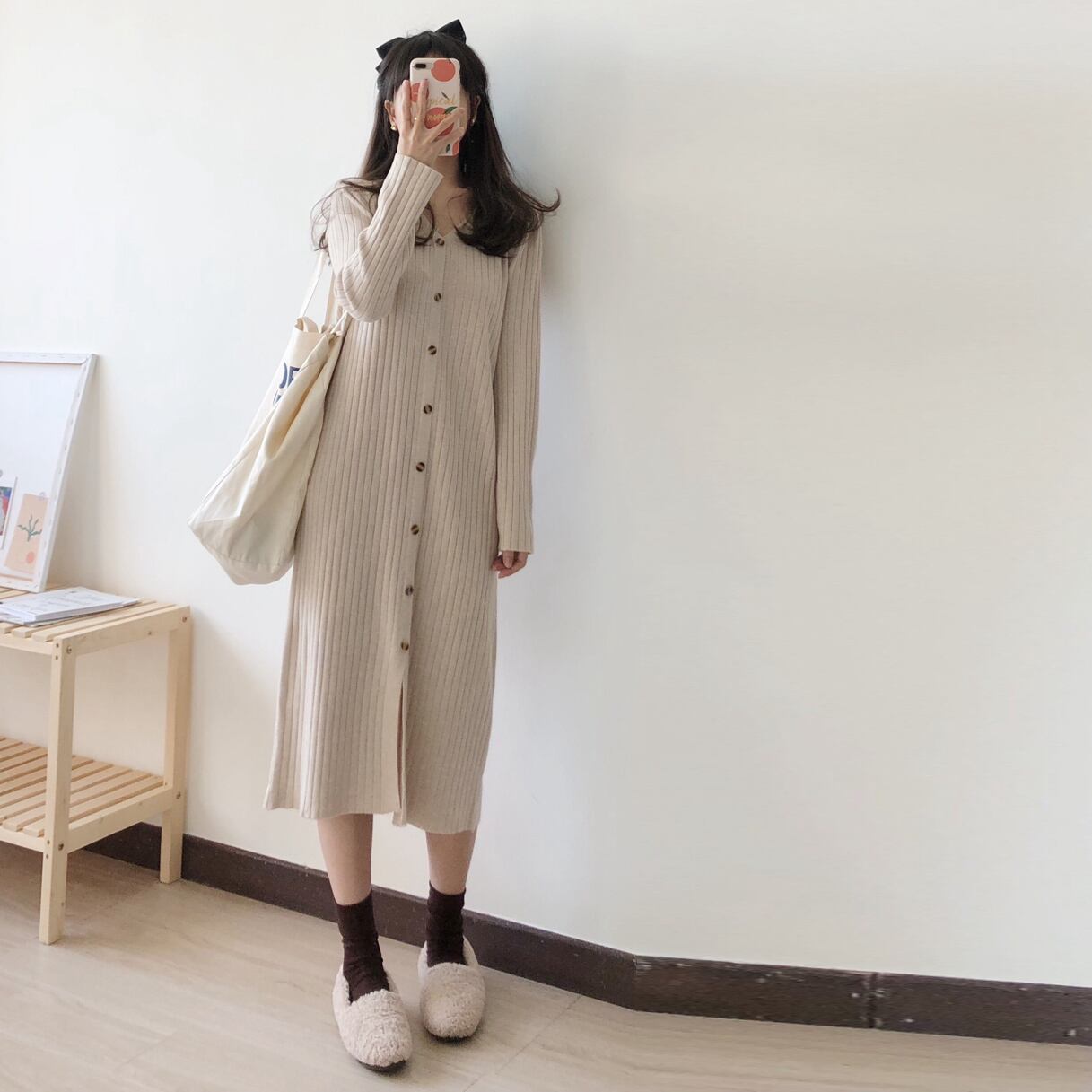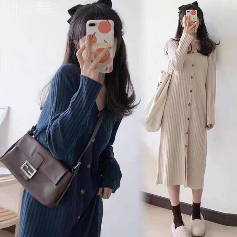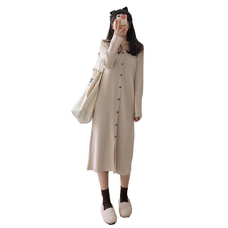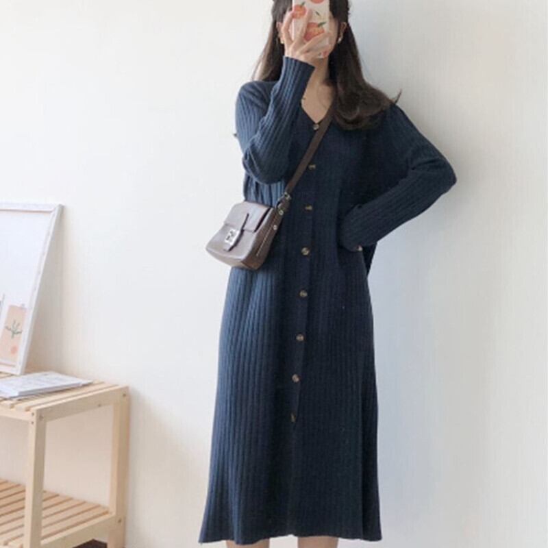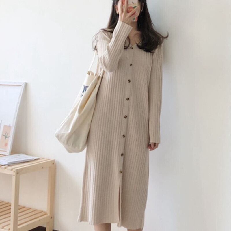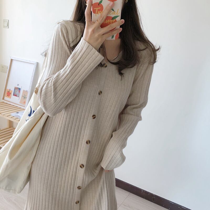 フロントボタン 着痩せ ニットワンピ 前スリット ワンピース ひざ丈 膝下 ミディアム丈 袖あり 長袖 ドロップショルダー Vネック 襟なし Iライン スマート リブ ニット きれいめ シンプル カジュアル 大人 上品 おしゃれ お洒落 大人女子 こなれ感 無地 春 秋 冬 レディース 女性用 ママ 女の子 学生 通学 デート お出かけ 女子会 休日 着回し 普段使い 重ね着 韓国系 オルチャン コーデ スタイル 体系カバー 定番 大きいサイズ ベージュ ネイビー