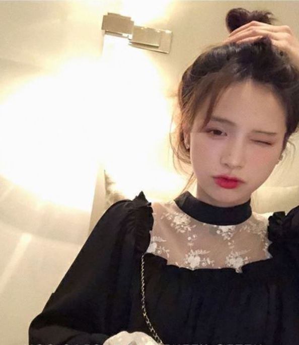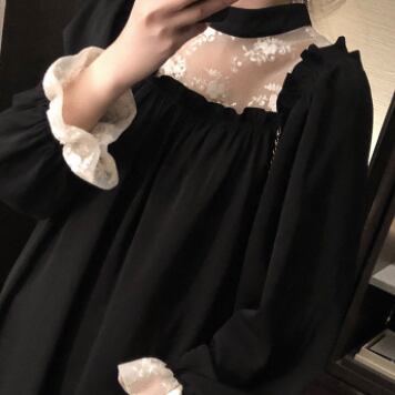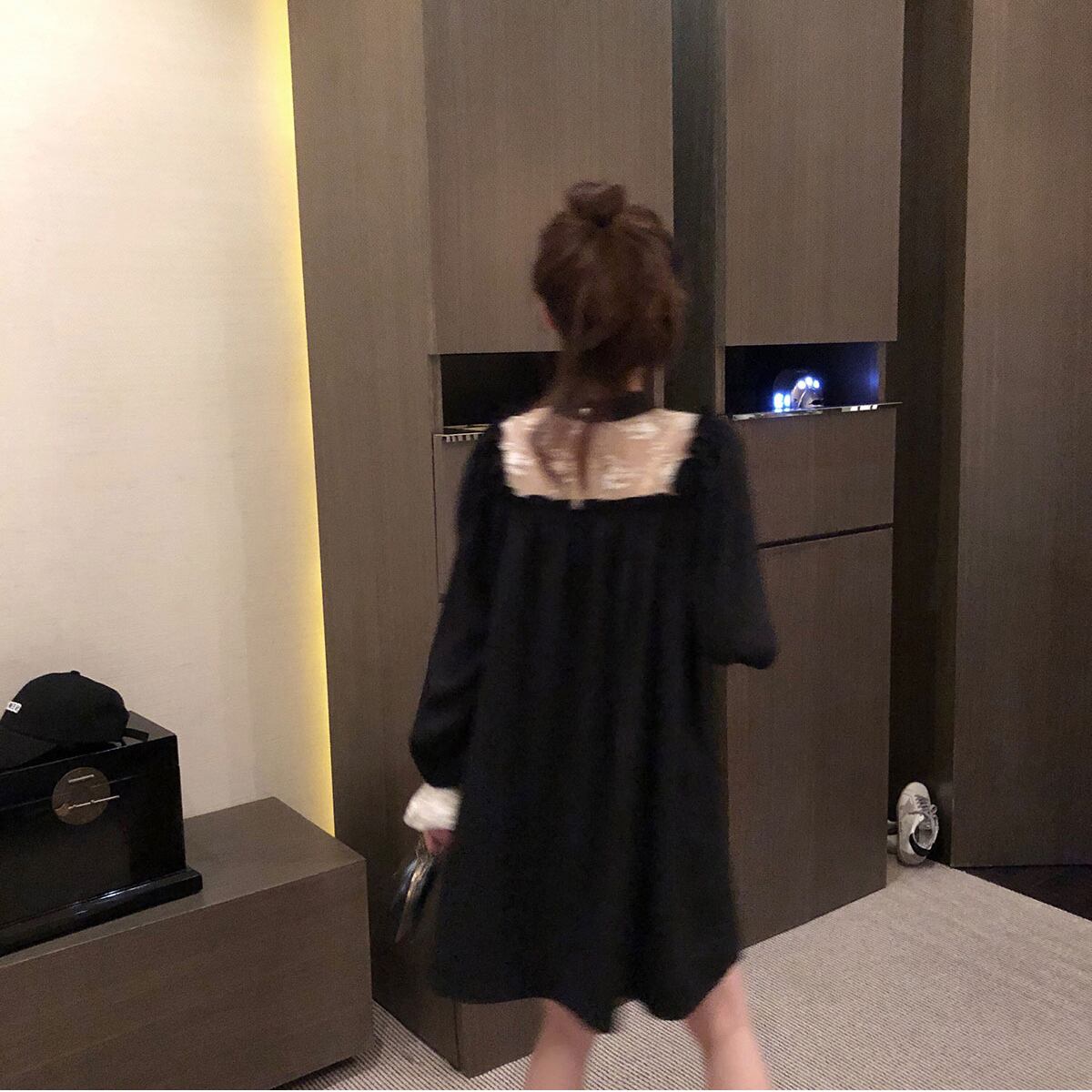 シアーレーストップスの上に黒の前後スクエアネックワンピを重ね着しているように見える異素材切替えデザインがおしゃれなブラックワンピース。