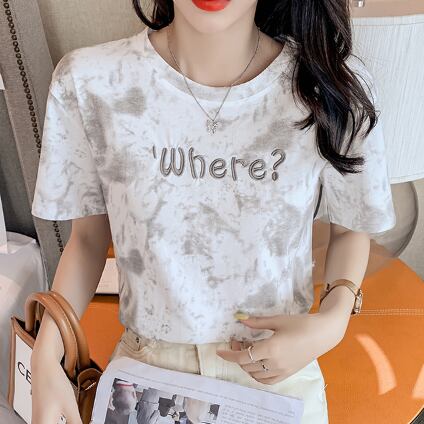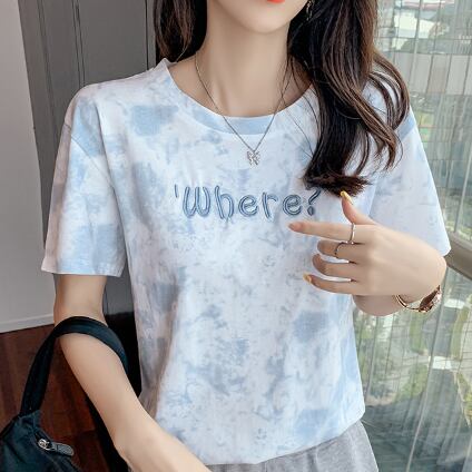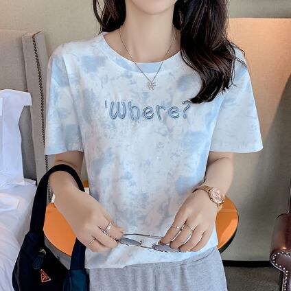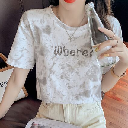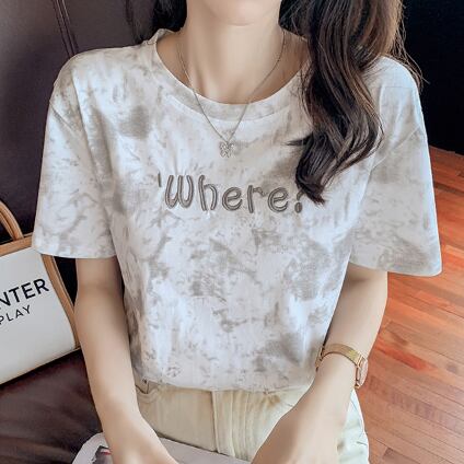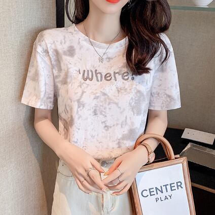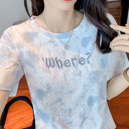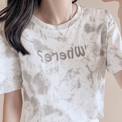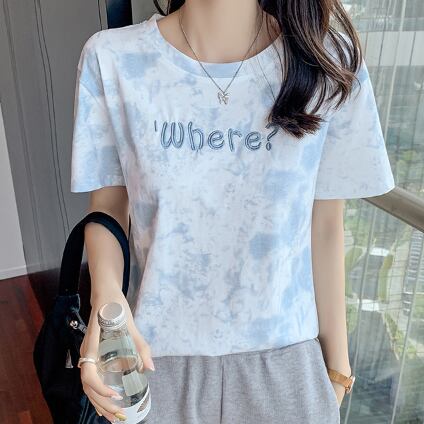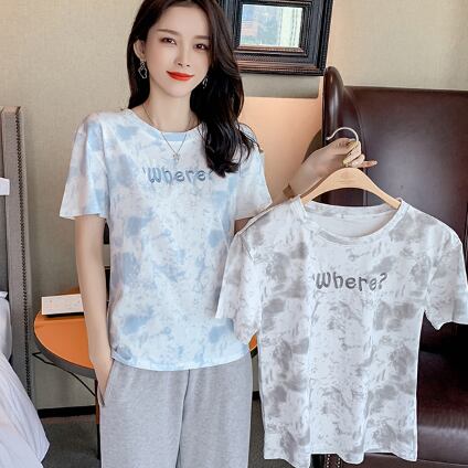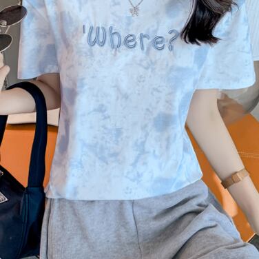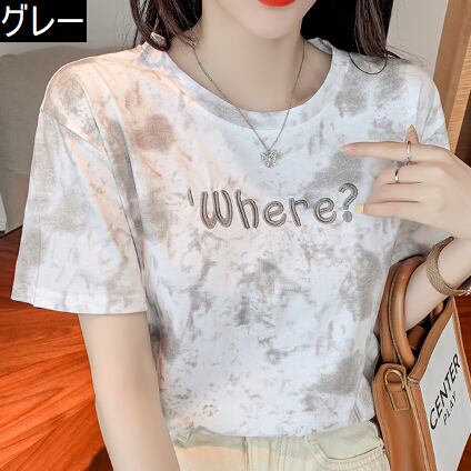Tシャツ 絞り染めプリント トップス カジュアル グレー 灰色 ブルー 青 ショート丈 袖あり 半袖 ラウンドネック ストレート 大人女子 大人 上品 おしゃれ きれいめ シンプル デイリーウェア レトロ レトロ風 こなれ感 ラフ 主役級 存在感 柄 プリント アルファベット 文字 夏 サマー 10代 20代 レディース 女性用 学生 通学 デート お出かけ 女子会 着回し 普段使い ファッション コーデ 定番 S M L XL ペールトーン 淡色