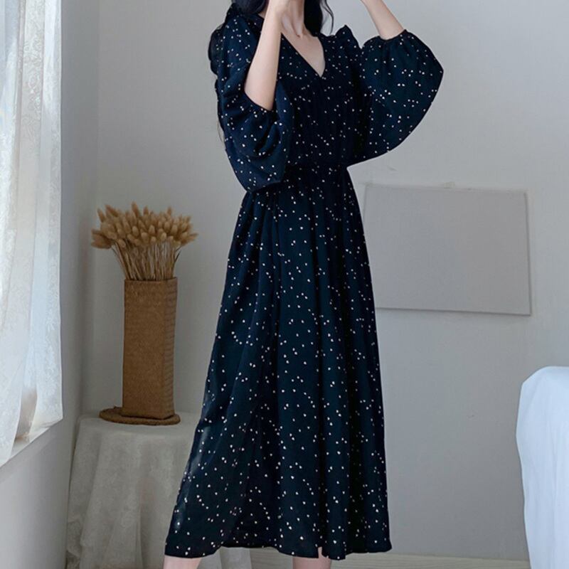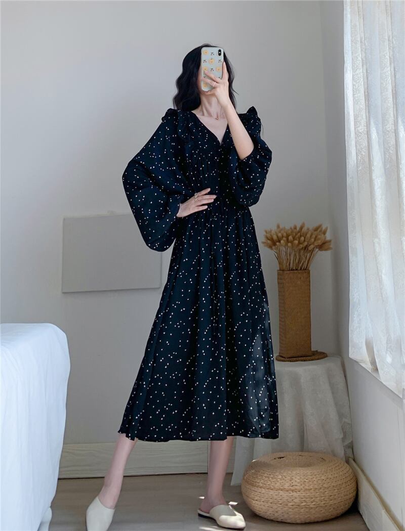 フェミニンで上品な印象を与えるシフォンワンピースが登場。黒とシルバーのドット柄が主役級の存在感を放ち、ロング丈のAラインシルエットで上品さを演出します。お袖は長めなので、季節の変わり目にも重宝します。Vネックでデコルテラインも魅せ、女性らしい印象を与えます。