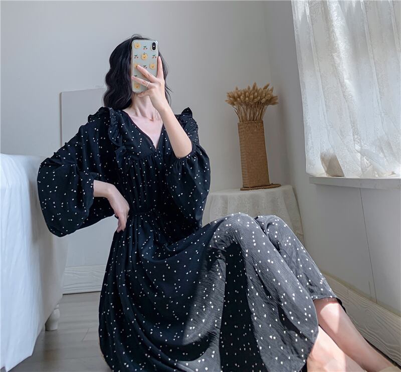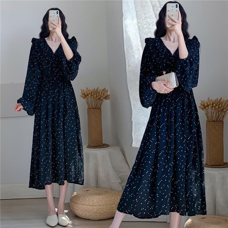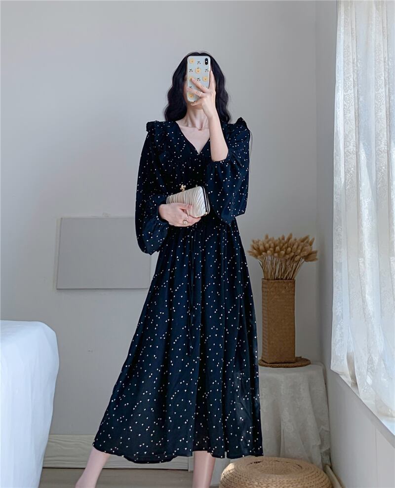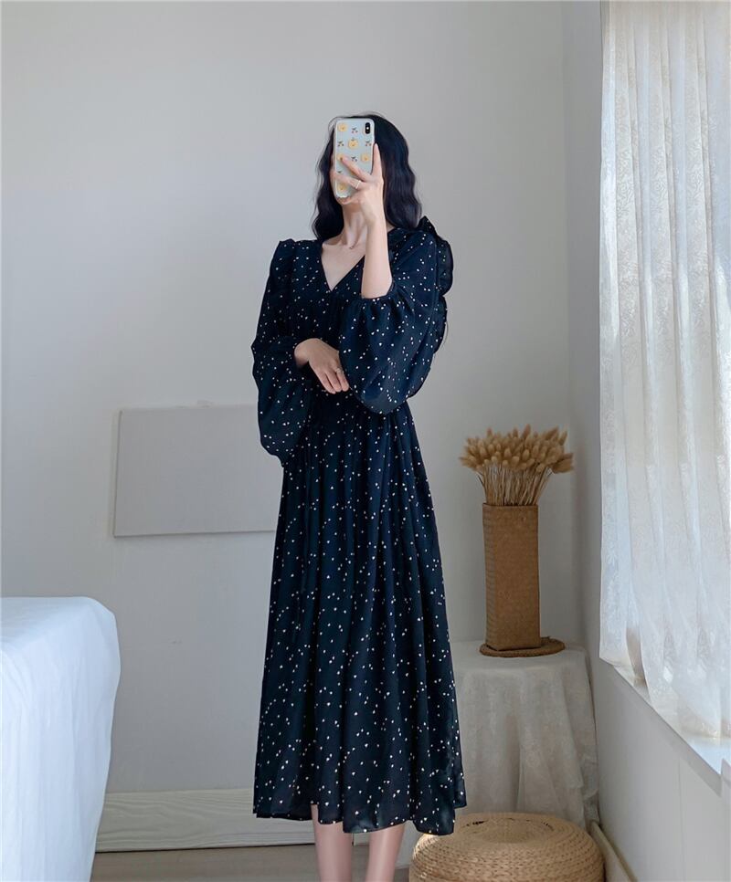 シフォンワンピース トップス フェミニン ブラック 黒 シルバー ロング丈 袖あり 長袖 Vネック Aライン シフォン 大人女子 大人 上品 おしゃれ エレガント レトロ レトロ風 こなれ感 ラフ 個性的 デザイン 主役級 存在感 柄 ドット柄 水玉 春 スプリング 秋 オータム 10代 20代 30代 レディース 女性用 オフィス ビジネス OL 通勤 デート お出かけ 女子会 トレンド ファッション コーデ 細見え XL 2XL 3XL 4XL 大きいサイズ プラスサイズ