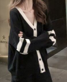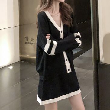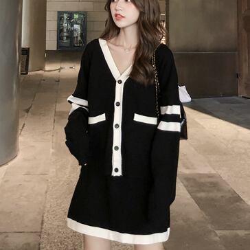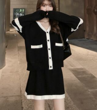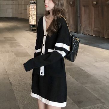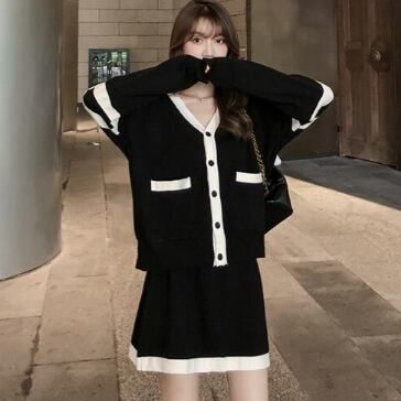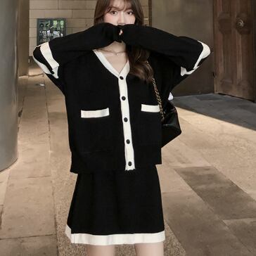 このセットアップは、Vネックのニットカーディガンとひざ丈のフレアスカートが上下でセットになっています。伸縮性があるので、履き心地もバツグン。また、シンプルな無地デザインは着回し力も抜群で、10代から40代まで幅広い年齢層の女性の方におすすめです。