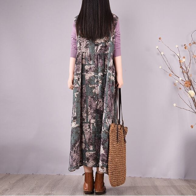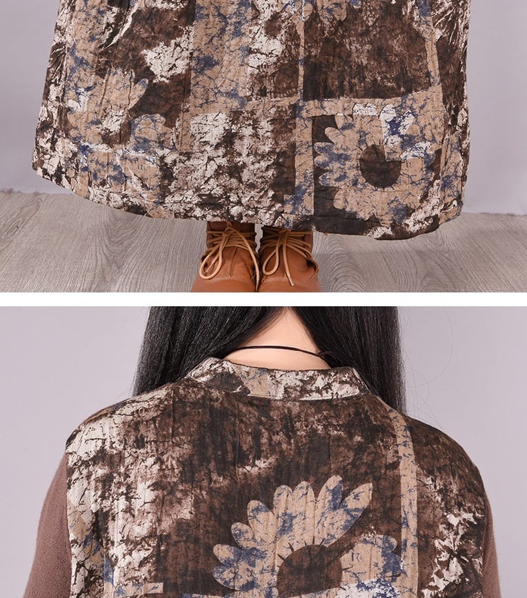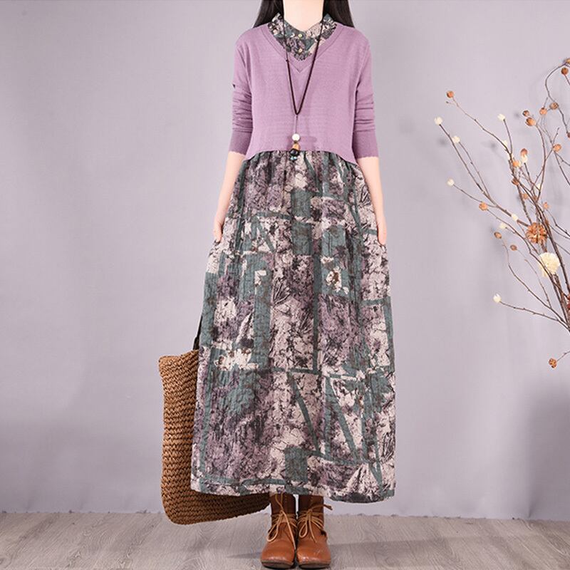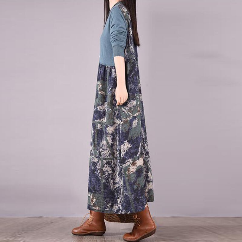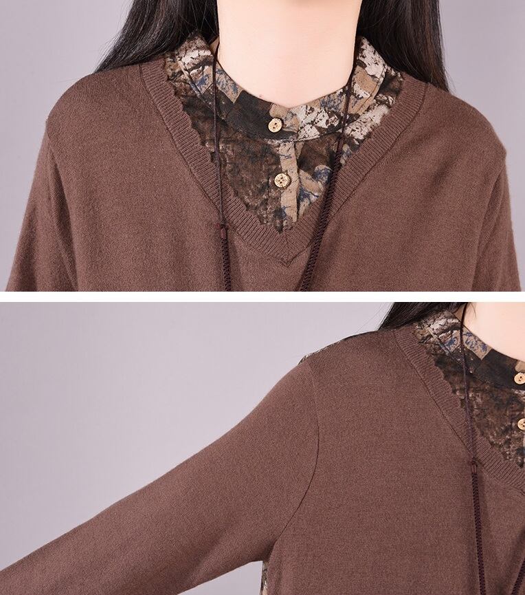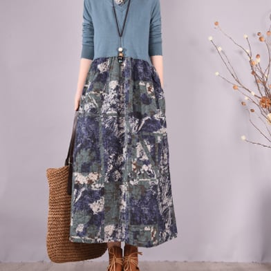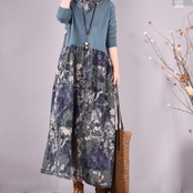 アート調の花柄シャツワンピにVネックニットを重ね着しているように見える、フロント&袖異素材切替えデザインのワンピース。