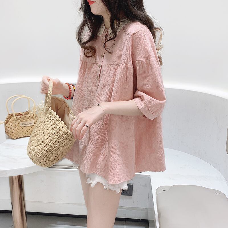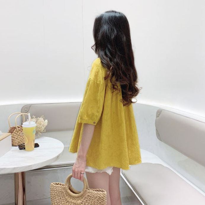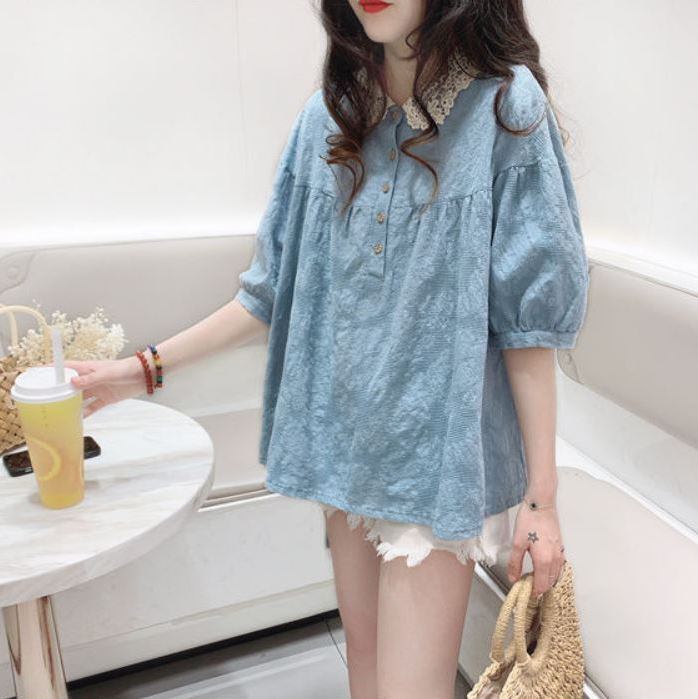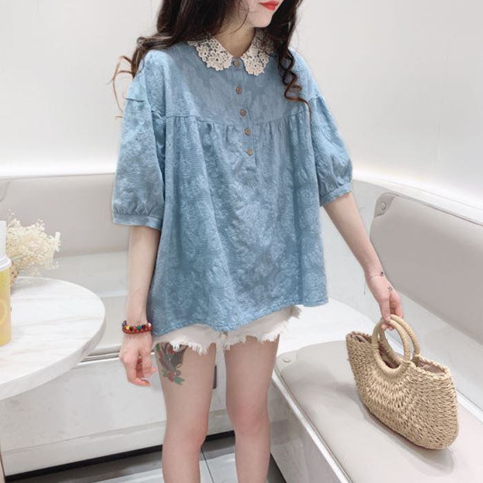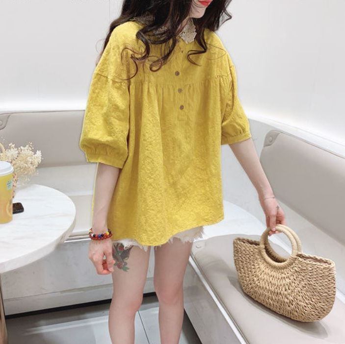 オーバーサイズ フラワージャカード ギャザー切替え トップス ブラウス ミディアム丈 半袖 五分袖 パフスリーブ 襟付き Aライン 切り替えデザイン 大人可愛い シンプル カジュアル 大人 上品 おしゃれ レトロ こなれ感 キュート ガーリー 花柄 春 秋 冬 レディース ママ マタニティ 女の子 学生 通学 デート お出かけ 休日 普段使い 楽ちん 体系カバー 韓国系 S M L XL 2XL 3XL 大きめ ゆったり サイズ ブルー イエロー ピンク