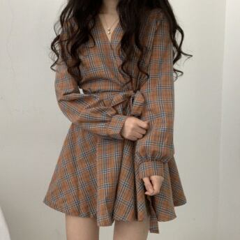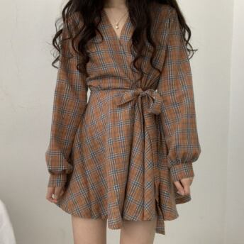 大人可愛いチェックワンピースの登場です。レッドとブラウンの混ざった色合いが、上品でありつつもアクセントになり、コーディネートを華やかにしてくれます。