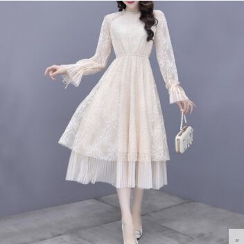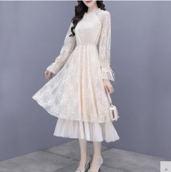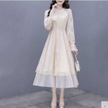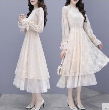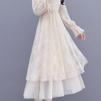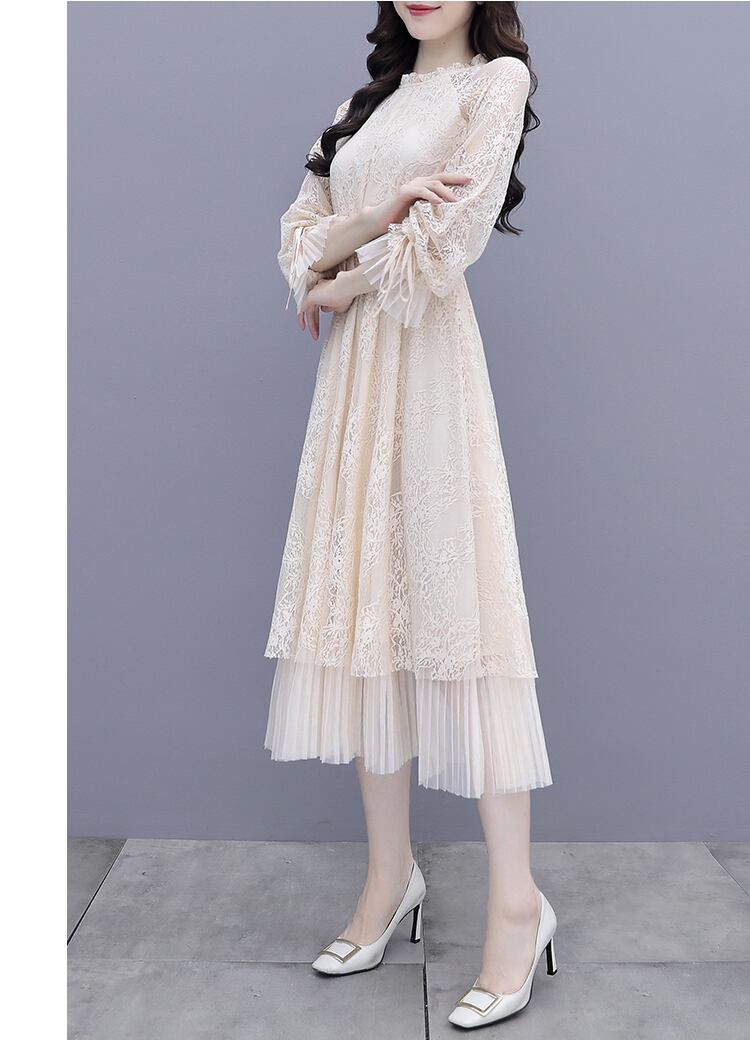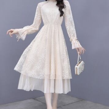 レースワンピース トップス スイート ガーリー アプリコット ミディアム丈 袖あり 長袖 ラウンドネック Aライン レース 大人女子 大人 上品 おしゃれ エレガント レトロ レトロ風 こなれ感 ラフ キュート かわいい 女子 個性的 デザイン 主役級 存在感 無地 春 スプリング 秋 オータム 20代 30代 オフィス ビジネス OL デート お出かけ 女子会 イベント リゾート 旅行 トレンド ファッション コーデ 美脚 足長 S M L XL ペールトーン 淡色