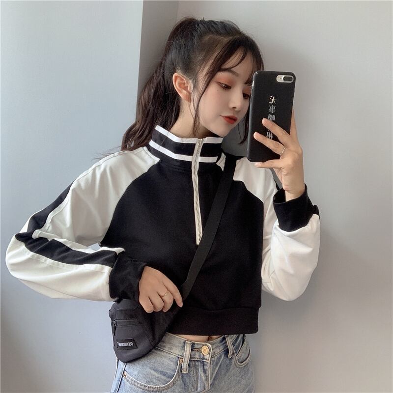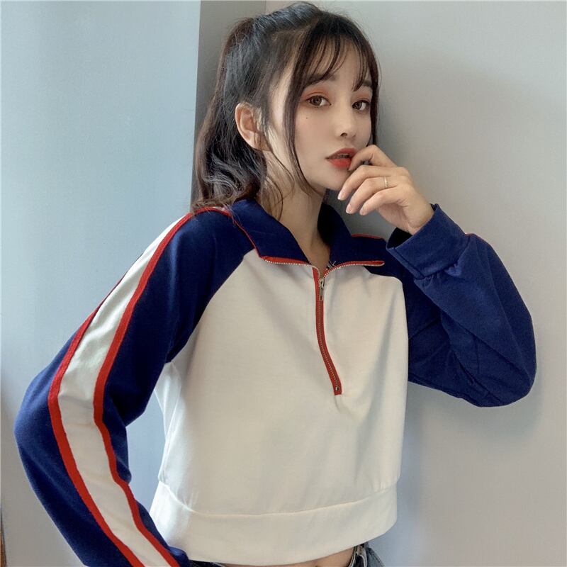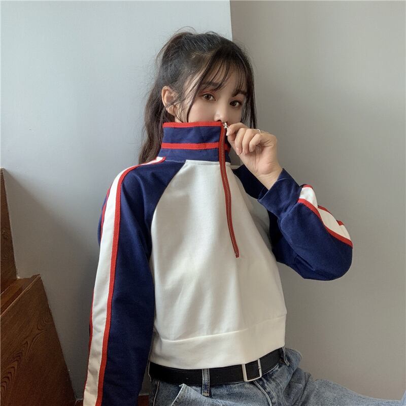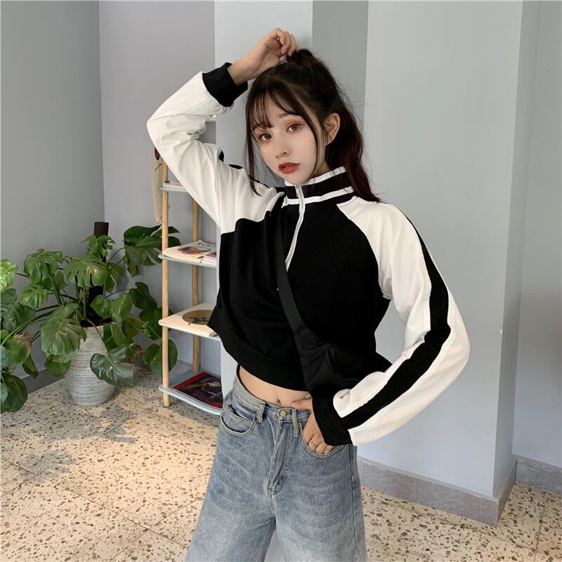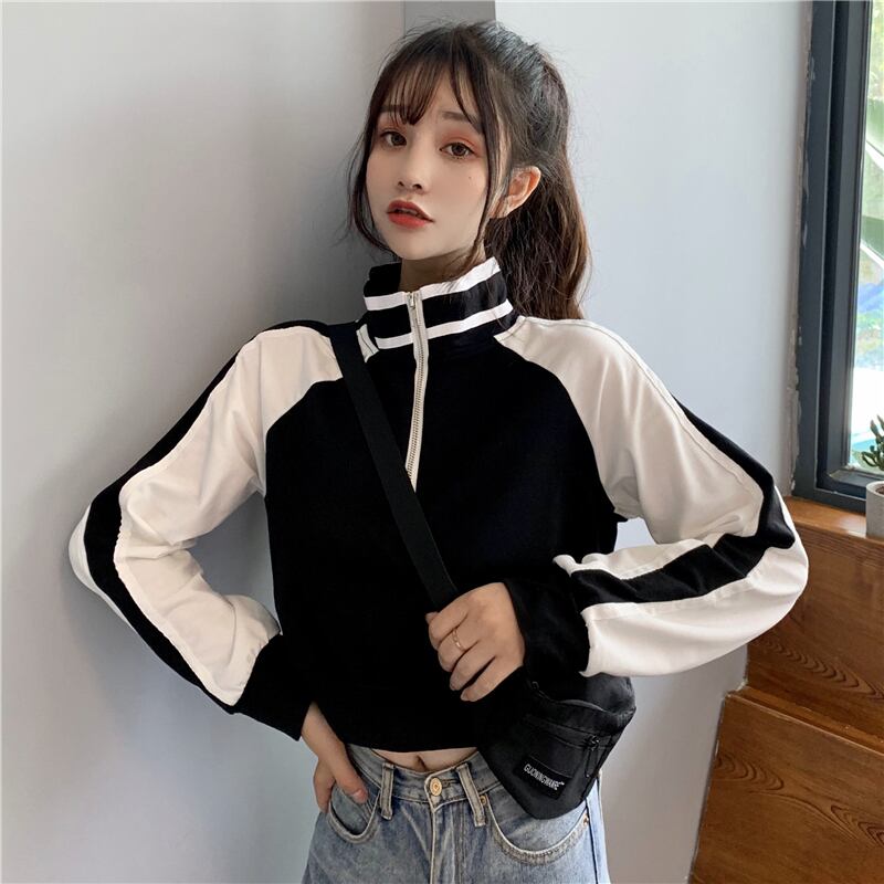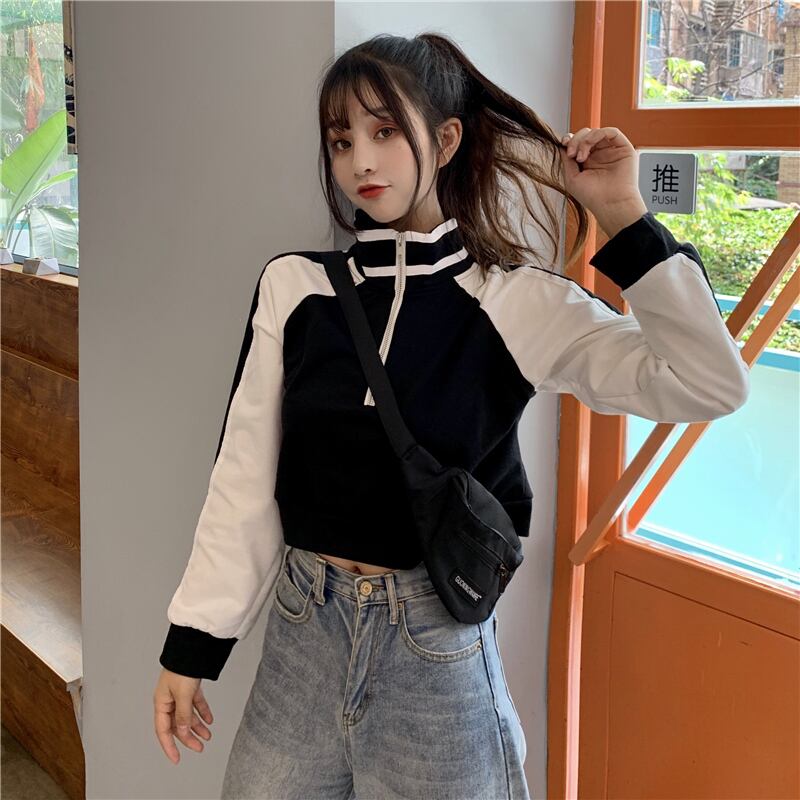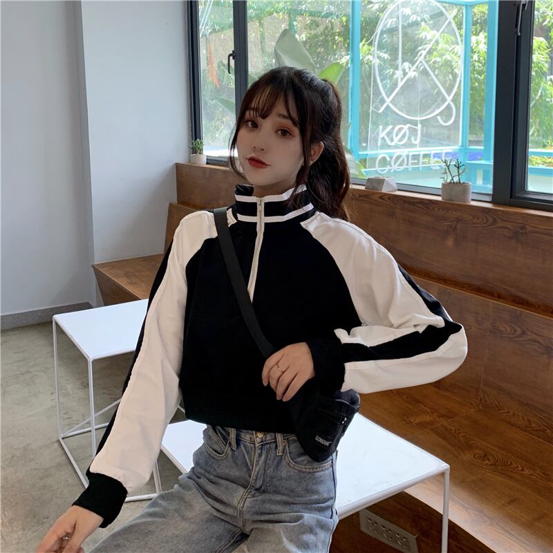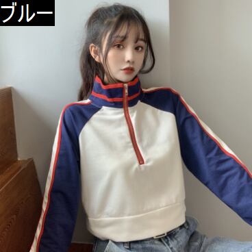 ショート丈トレーナー トップス プルオーバー スポーティ ブラック 黒 ブルー 青 ショート丈 袖あり 長袖 スタンドカラー ストレート ファスナー ジッパー 大人女子 大人 上品 おしゃれ デイリーウェア レトロ レトロ風 こなれ感 ラフ ルーズ シルエット 個性的 デザイン 主役級 存在感 柄 配色 コントラストカラー 秋 オータム 20代 10代 レディース 女性用 学生 通学 休日 おうち 着回し 普段使い M L XL 大きいサイズ プラスサイズ マルチカラー 多色