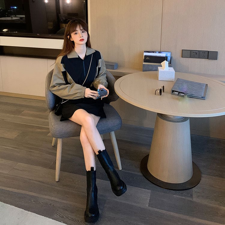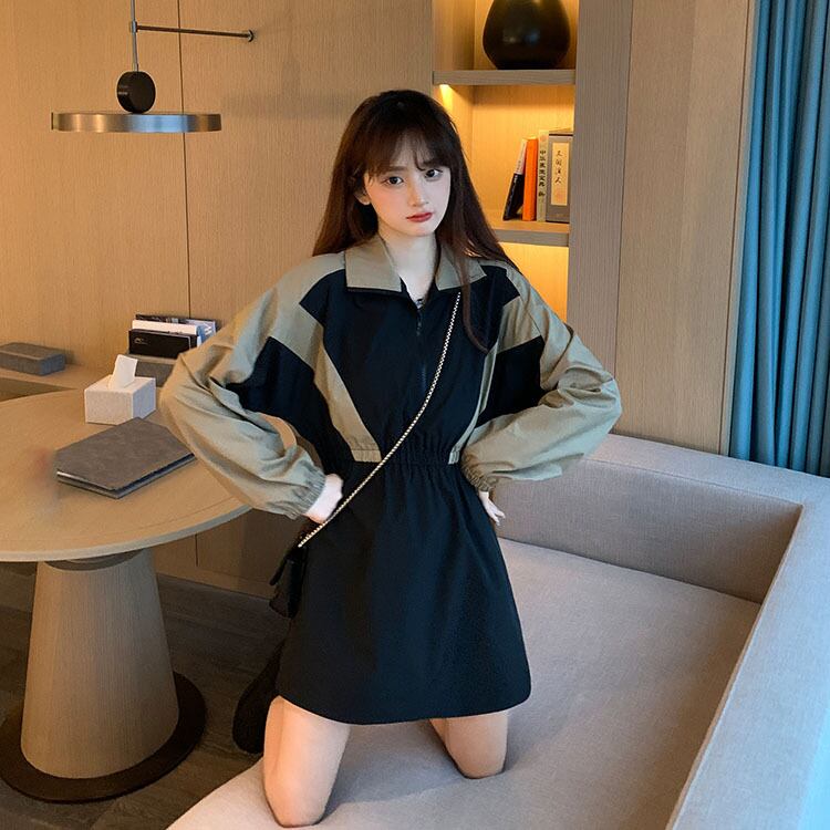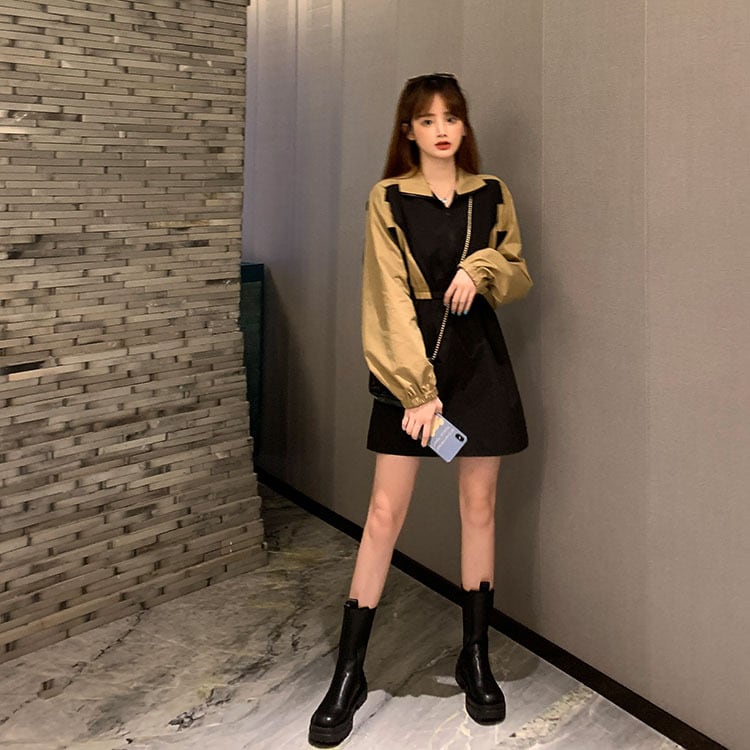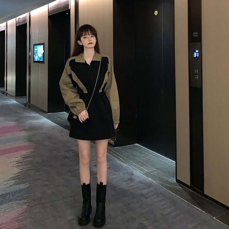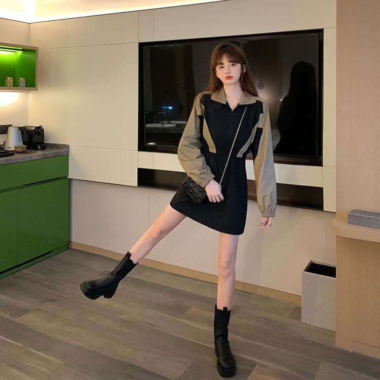 ミニワンピース トップス カジュアル ブラック 黒 ミニ丈 ショート丈 袖あり 長袖 襟付き Aライン ファスナー ジッパー 大人女子 大人 上品 おしゃれ デイリーウェア レトロ レトロ風 こなれ感 ラフ ルーズ シルエット 個性的 デザイン 主役級 存在感 柄 配色 秋 オータム 20代 10代 学生 通学 デート お出かけ 女子会 着回し 普段使い トレンド ファッション コーデ 美脚 足長 細見え スタイル S M L バイカラー ツートーンカラー