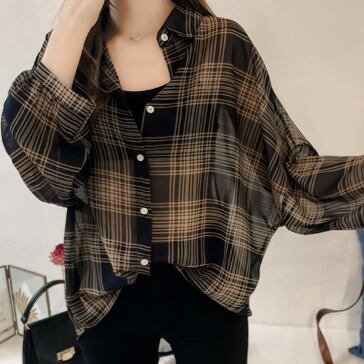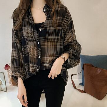 ゆったりサイズのチェック柄長袖ブラウスです。