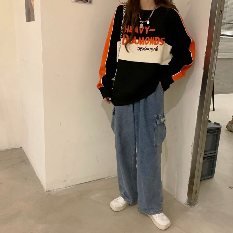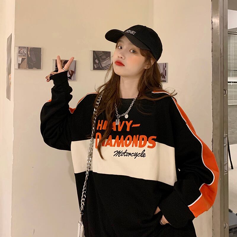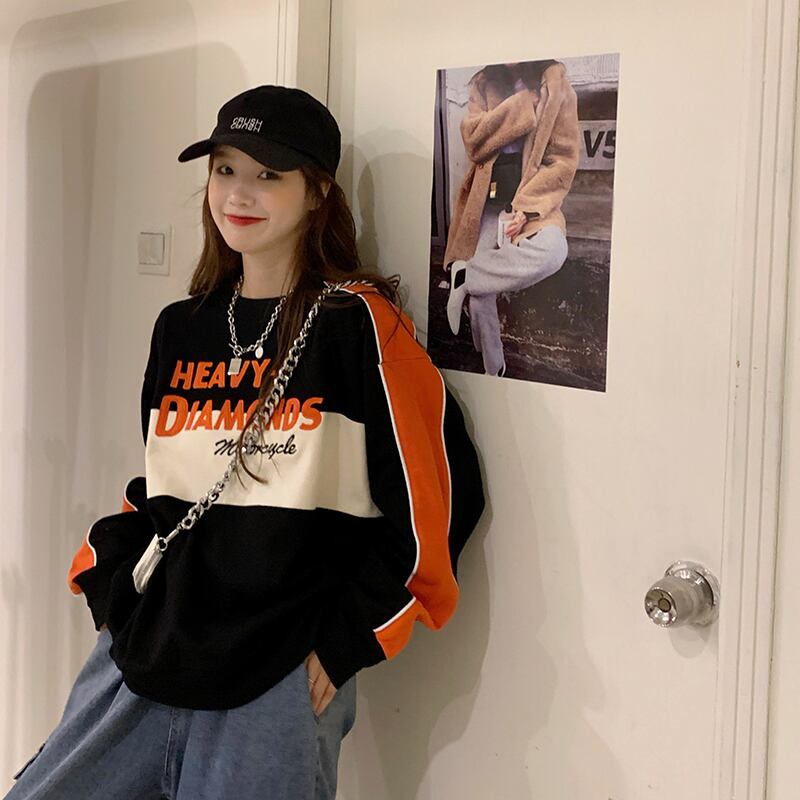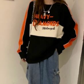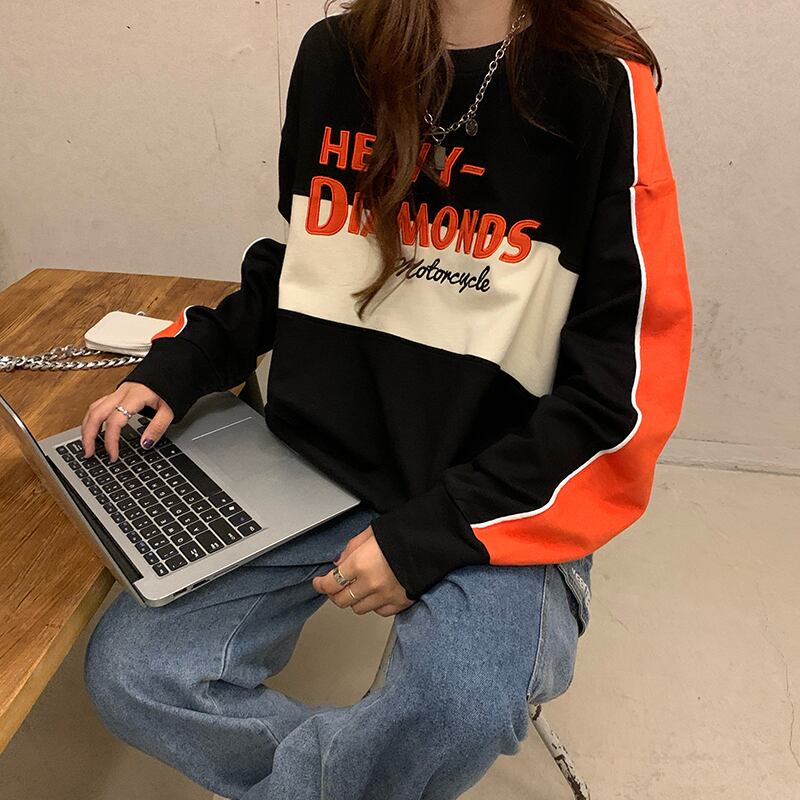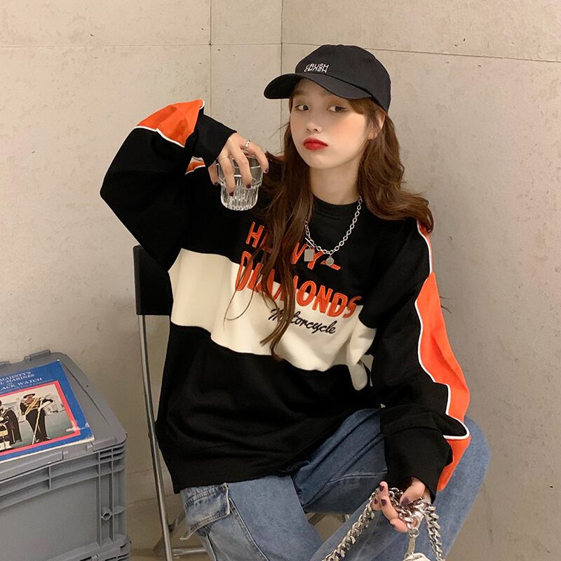 ラウンドネックプルオーバー トップス トレーナー スポーティ ストリート レギュラー丈 袖あり 長袖 ラウンドネック ストレート 大人女子 大人 上品 おしゃれ デイリーウェア レトロ レトロ風 こなれ感 ラフ ルーズ シルエット 個性的 デザイン 主役級 存在感 柄 配色 コントラストカラー アルファベット 文字 秋 オータム 20代 10代 30代 レディース 女性用 運動 アウトドア 動きやすい 休日 おうち 着回し 普段使い 定番 S M L XL