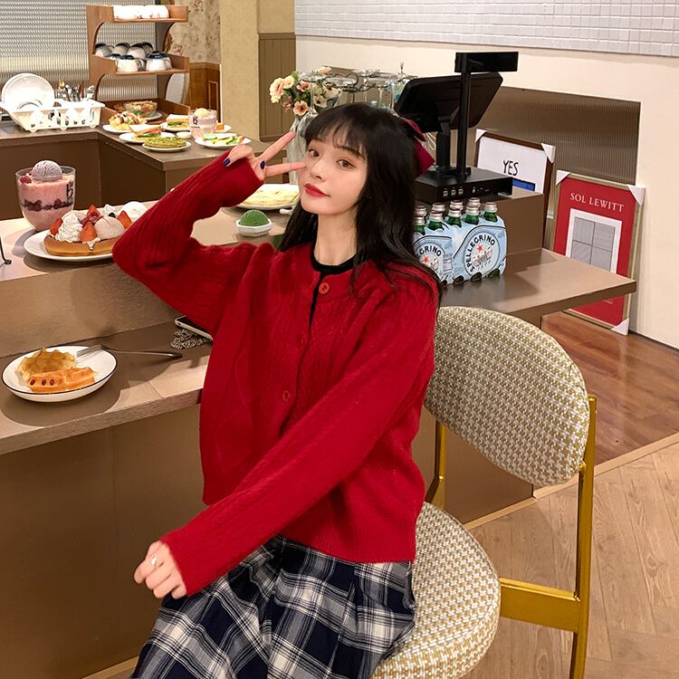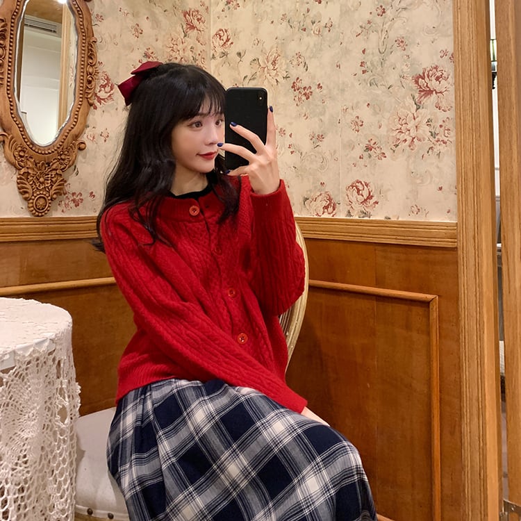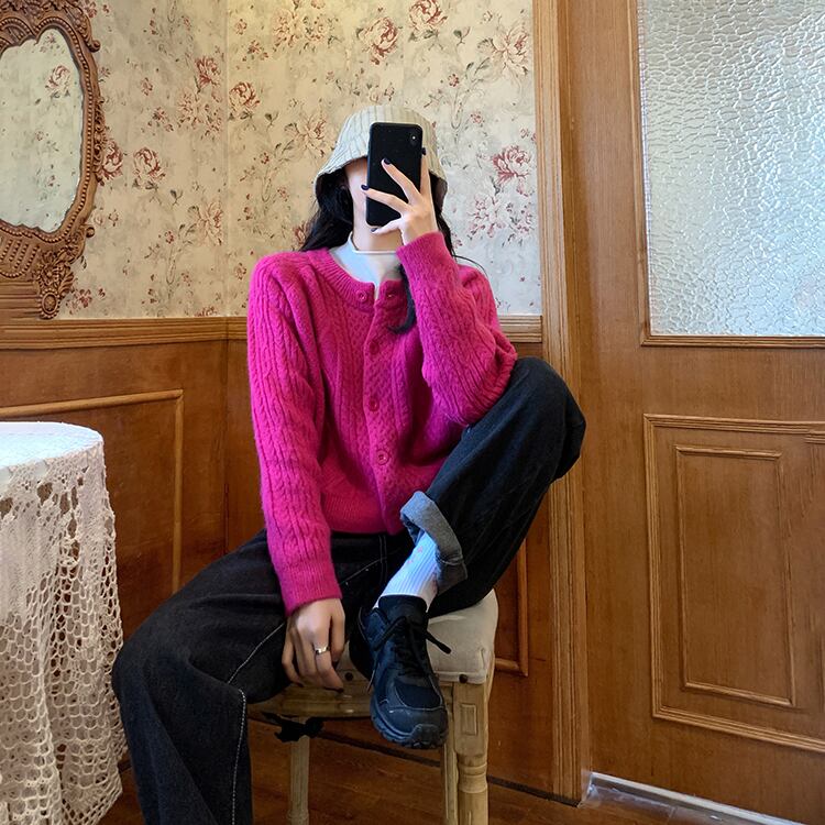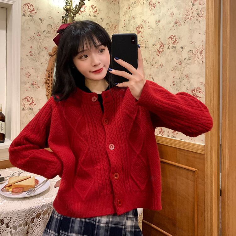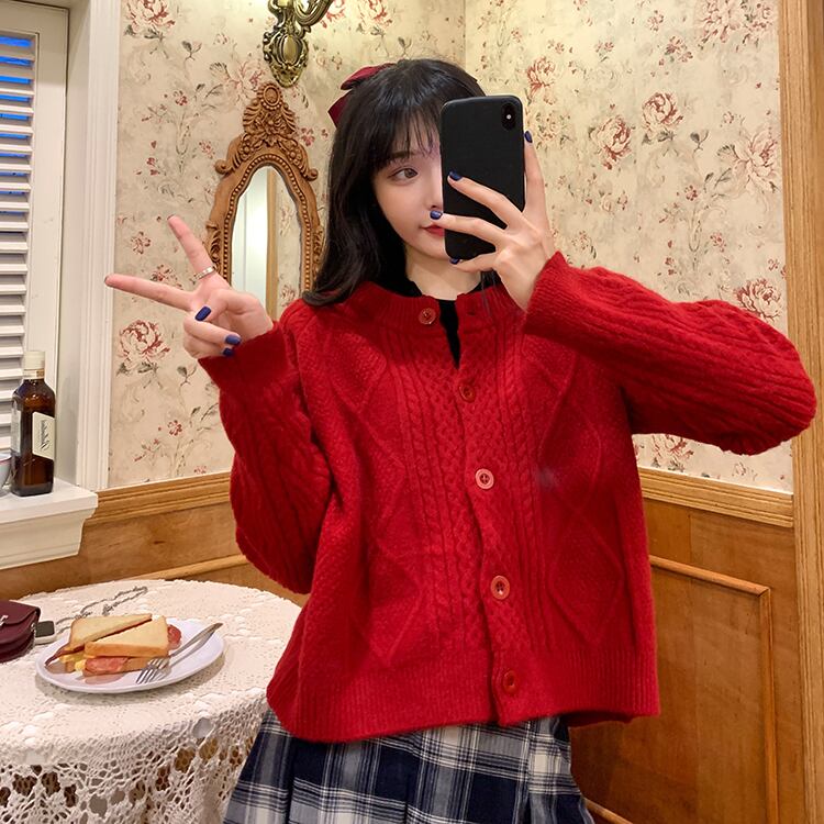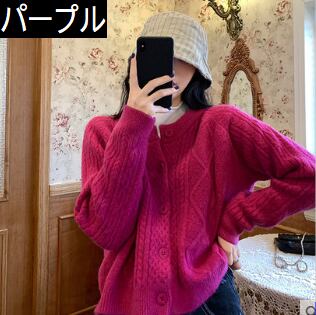 カーディガン トップス ニット フェミニン ウエスタン アプリコット パープル 紫 レッド 赤 ショート丈 袖あり 長袖 ラウンドネック ストレート シングルブレスト ボタン 大人女子 大人 上品 おしゃれ きれいめ シンプル デイリーウェア レトロ レトロ風 こなれ感 ラフ ルーズ シルエット キュート かわいい 女子 主役級 存在感 無地 秋 オータム 冬 ウインター 20代 10代 30代 レディース 女性用 学生 通学 デート お出かけ 女子会 重ね着 S M L