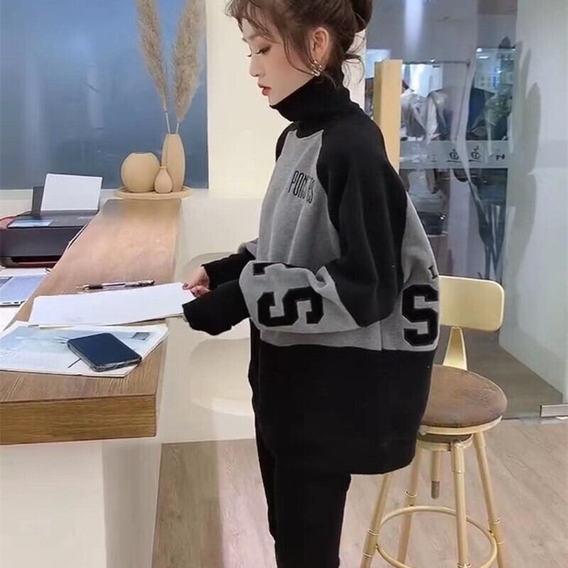ゆったりオーバーサイズで体のラインを強調せず、首元まで暖かなタートルネックデザインです。