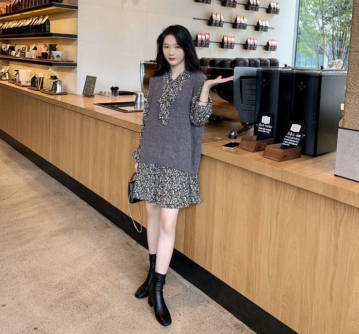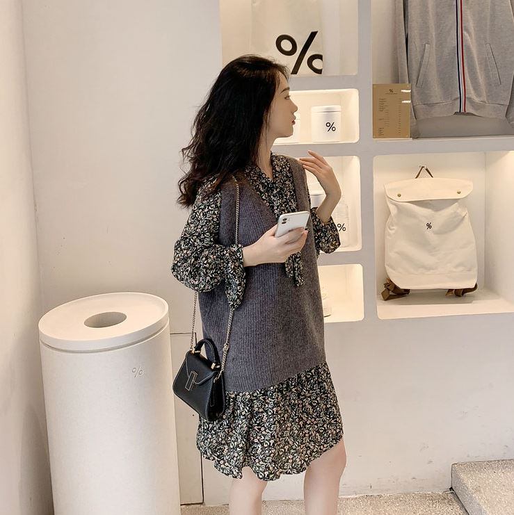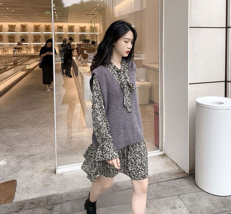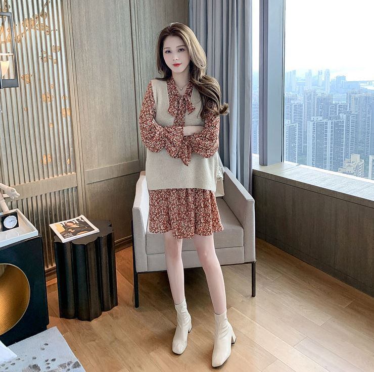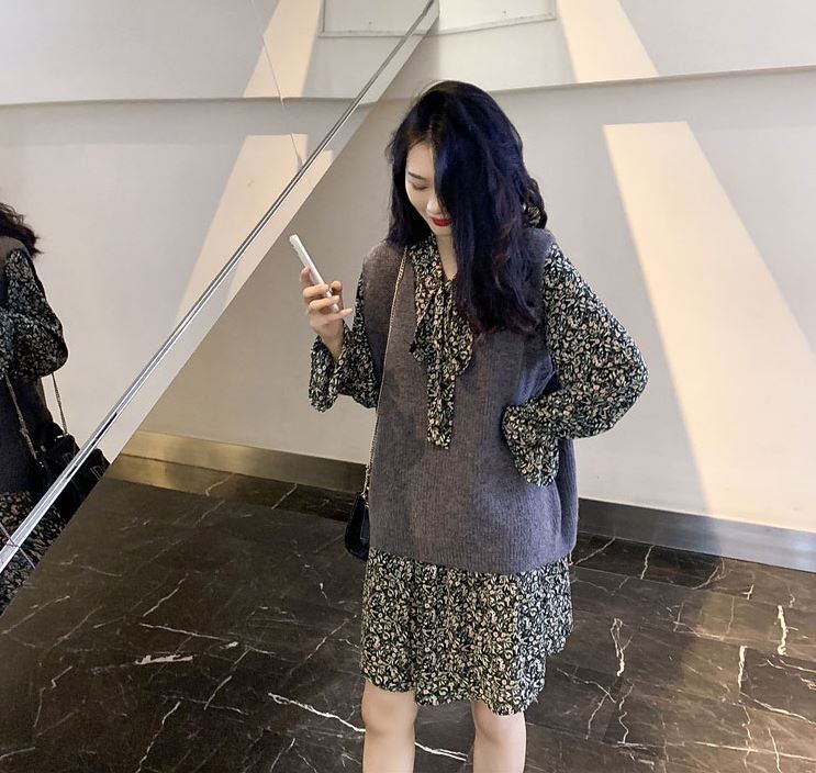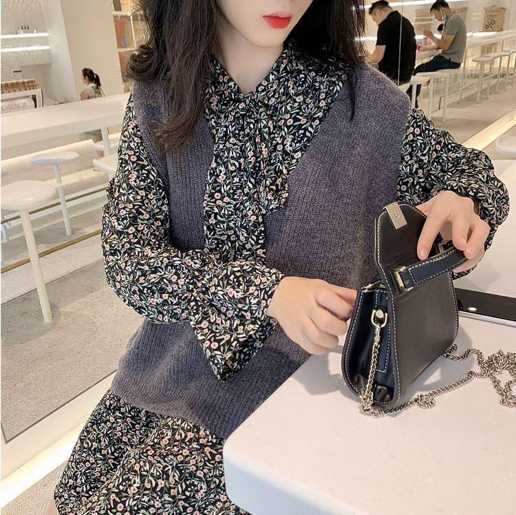 リボンタイネックの花柄シフォンワンピースと前後Vネックニットベストのセットアップ。