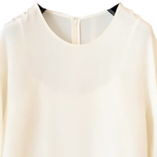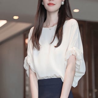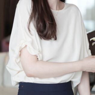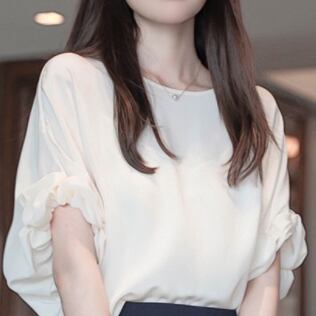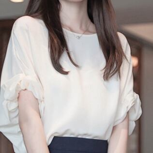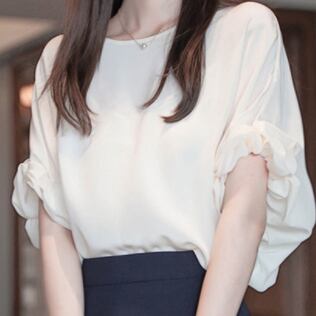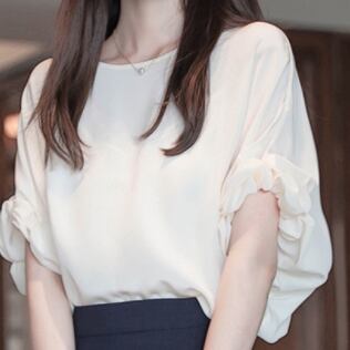 パフスリーブが女性らしい印象を与え、袖口のギャザーがボリューム感を演出。ラウンドネックで程よい首回りの開きが抜け感を出し、シフォン素材が肌触りと見た目の美しさを兼ね備えています。ルーズなシルエットもあり、デイリーウェアとしてもおしゃれに着こなせます。